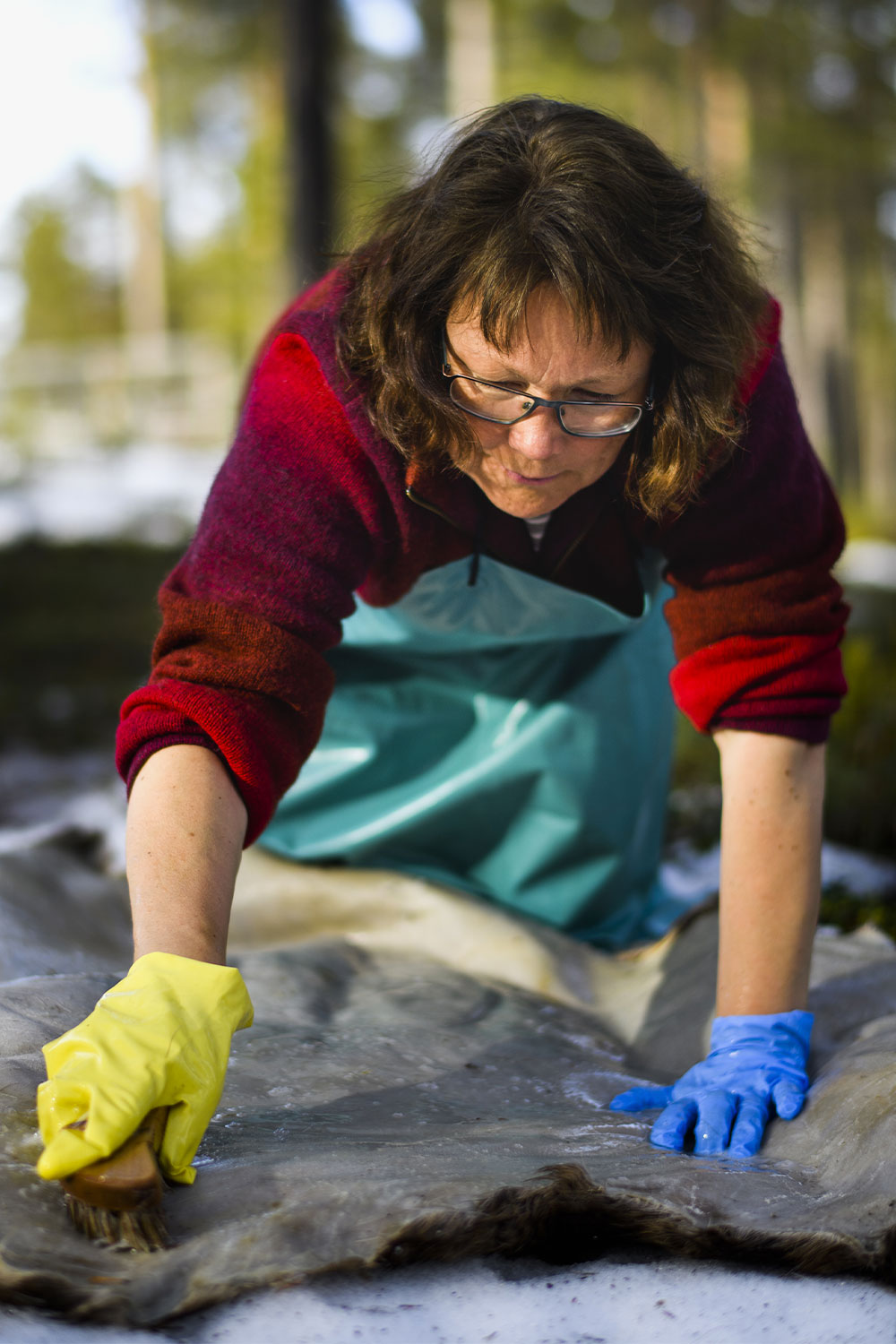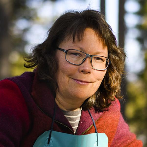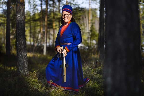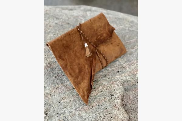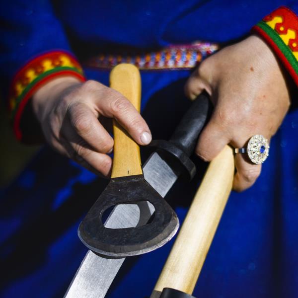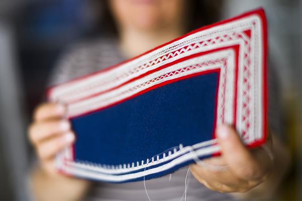 Craftsmanship runs in Katarina Spik Skum’s family. Already as a child, Katarina learned how to approach and work with Sami duodje thanks to her grandma and other women she grew up with. First, as a pastime, sewing and working with fabrics and yarns became a passion, and then a profession. “Now I work with duodje in many different ways and combine my creations with writing, lectures and courses”. Currently, Katarina lives in the town of Jokkmokk, where she founded her own company Duodje by KSS: “I started my own company in 2018, but I have been selling duodje on a smaller scale since 1988”. Her material preferences are reindeer leather, she mainly works with tin thread embroidery, leather sewing and finger braiding in yarn. The results are accessories and design pieces – from cushions to purses – created with great attention to detail.