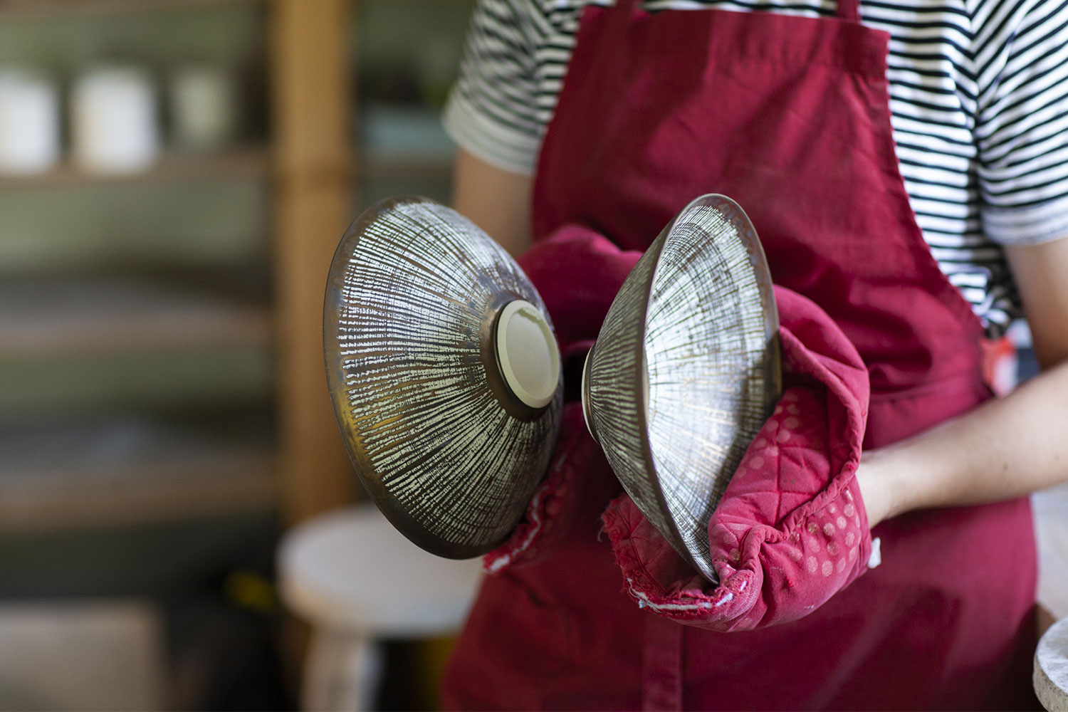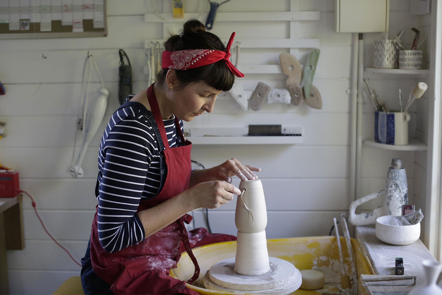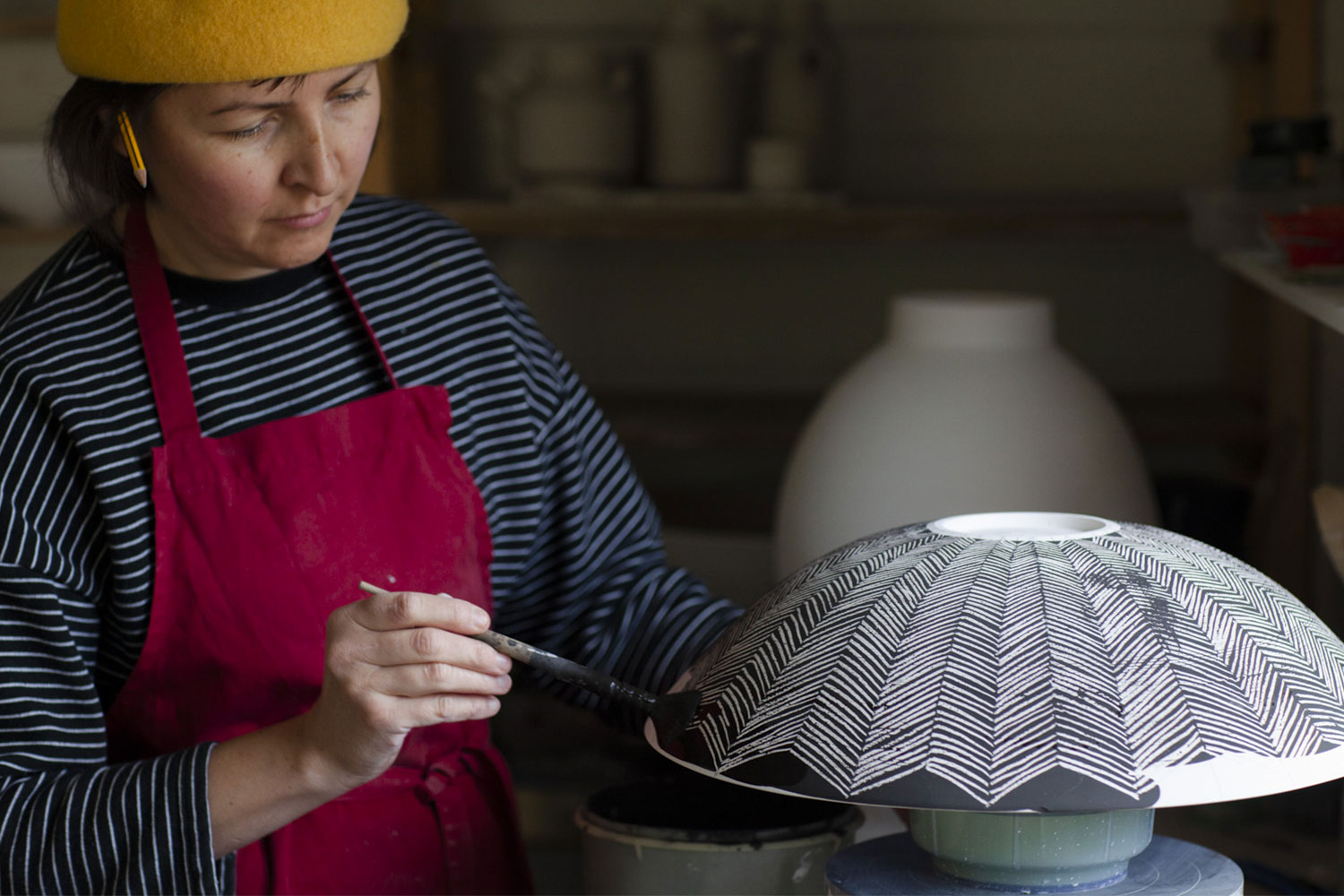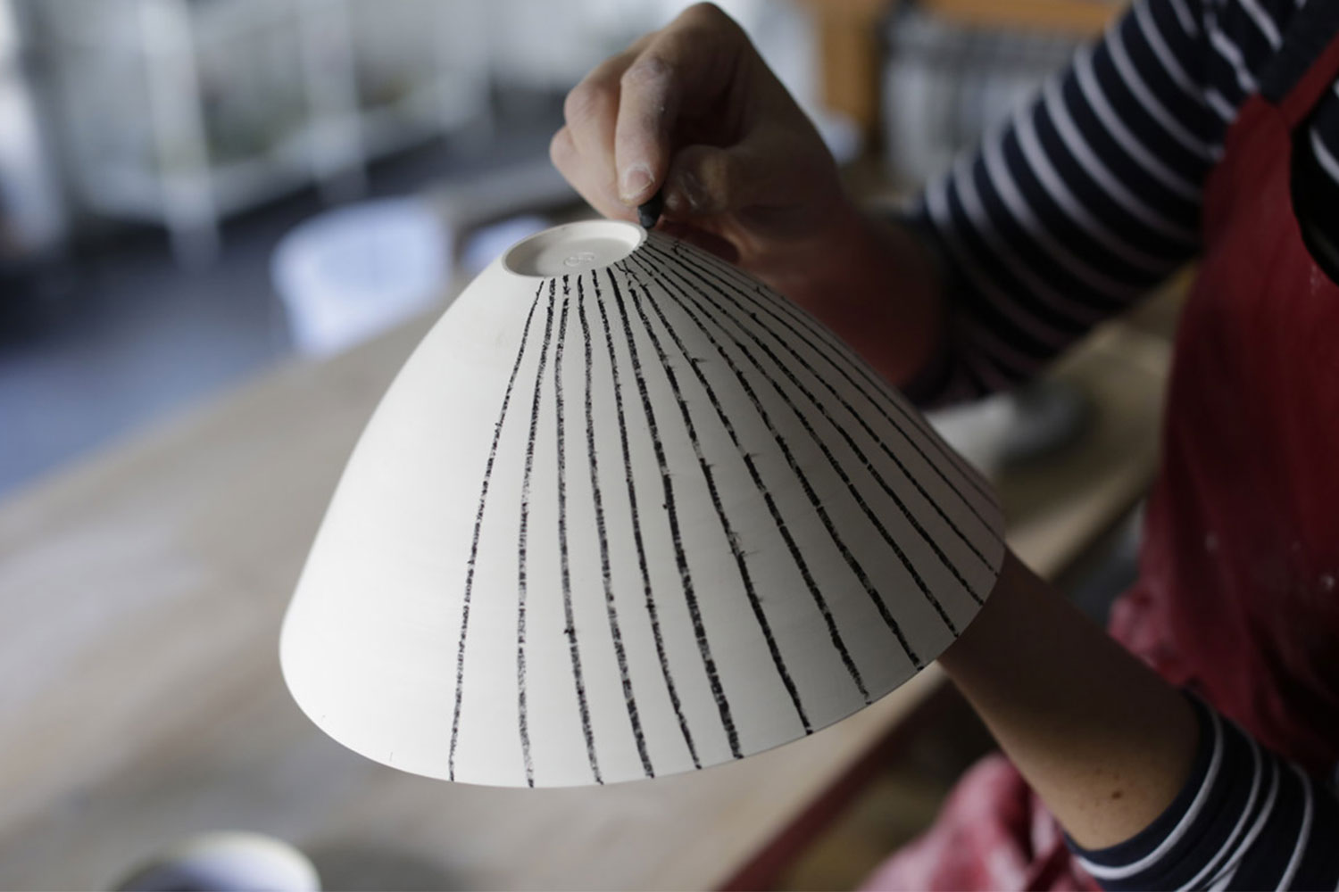 Katharina Klug is an Austrian-born potter and designer, a passionate ceramic artist, who was brought up working with clay. After college and some years spent in search of a space of her own, she has settled in Cambridge, where she runs her studio. Her research focuses on the exploration of shapes on the pottery wheel, the tool that allows her to find endless variations on a classic theme: the vessel. At the same time, her production stands out thanks to a very peculiar dialogue between the moulded piece and the graphic sign. Drawing freehand with her trademark crayons, she intentionally embraces imperfections in the surface pattern designs, while longing for perfection in the shape of the vessel. Her unique pieces are lively and immediate.