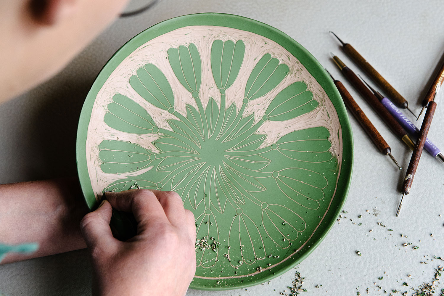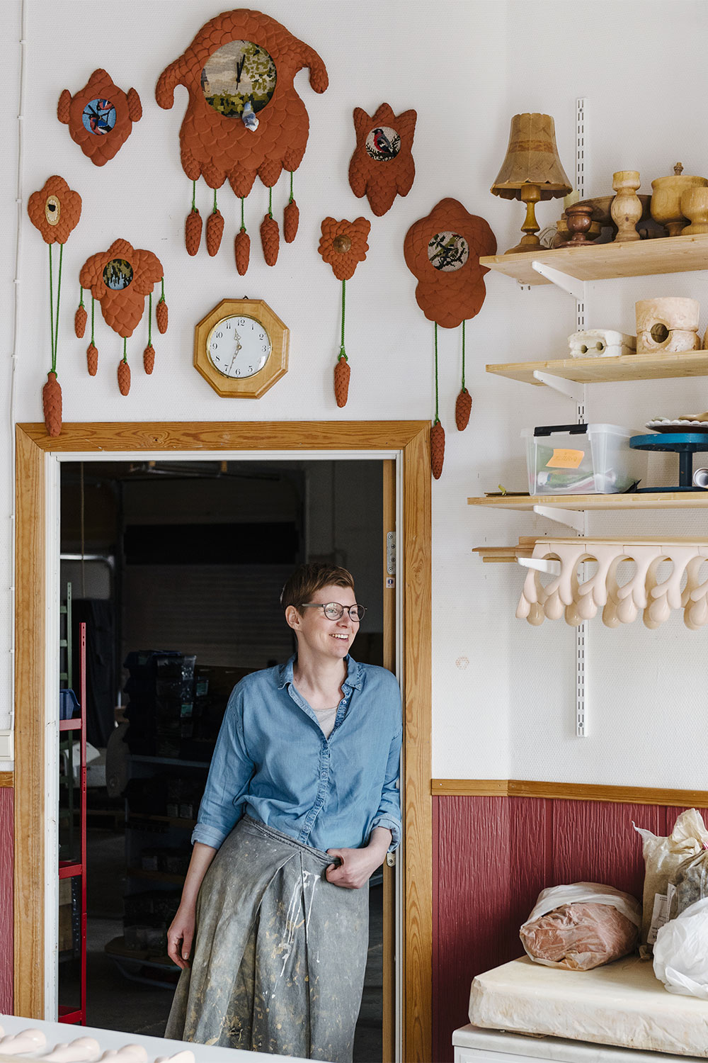 Kristine Thenman discovered clay at the age of 14, when she joined her sister on a pottery course. She became ecstatic about the material, its texture and mouldability, and still describes her relationship to it as an infatuation. Today, after a master's in ceramic art from the Academy of Art and Design in Gothenburg, she lives and works in the northern town of Arvika. Decoration is a central part of her work, and besides plates, bowls and candle holders, she makes clever and quirky pieces of ceramic wall decoration, clocks, lamps and edgings. The region around Arvika has a long tradition of ceramic craftsmanship. Kristine seeks inspiration in that tradition, as well as in nature, Art Nouveau and flea market finds, while always trying to inject a sense of playfulness.