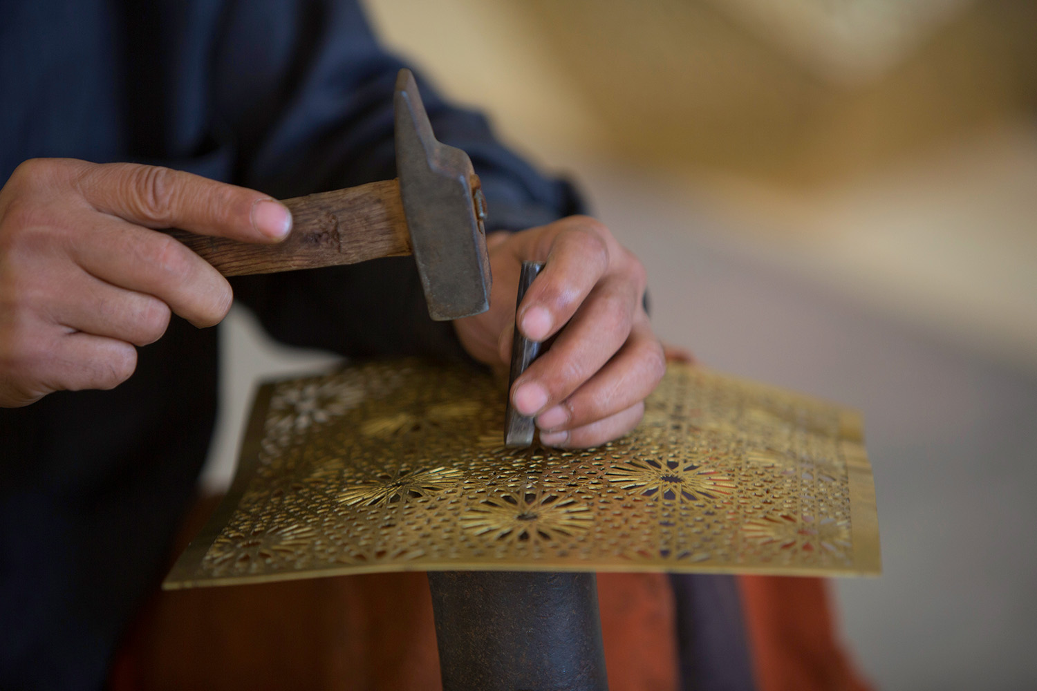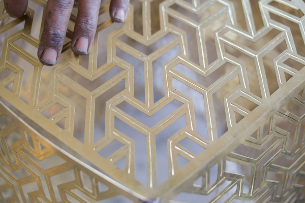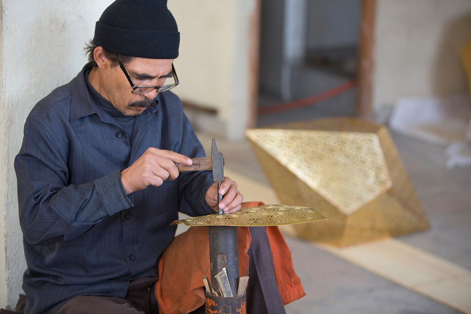 Mohammed Bouchareb, founder of L'art traditionnel, is as luminous as his work. Chiselled lamps are not rare in Morocco, but the beautiful workshop of L'art traditionnel is where a real variety of lamps of different shapes and designs can be found. From adventurous to poetic, chiselled copper lamps of all sizes are on display, as in an enchanted world. Each lamp is chiselled by hand with precision and care, using the sharpest tools. The drawings are first executed with a pencil on transparent paper and then reproduced on metal.