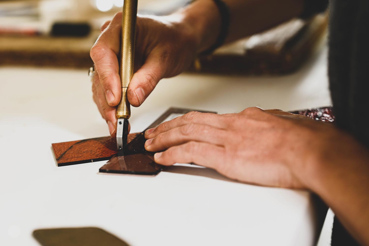 I work with versatile techniques such as kiln-firing and cold working glass, cutting and assembling metal, together with the mastery of digital tools and vector drawing for the design of my models.