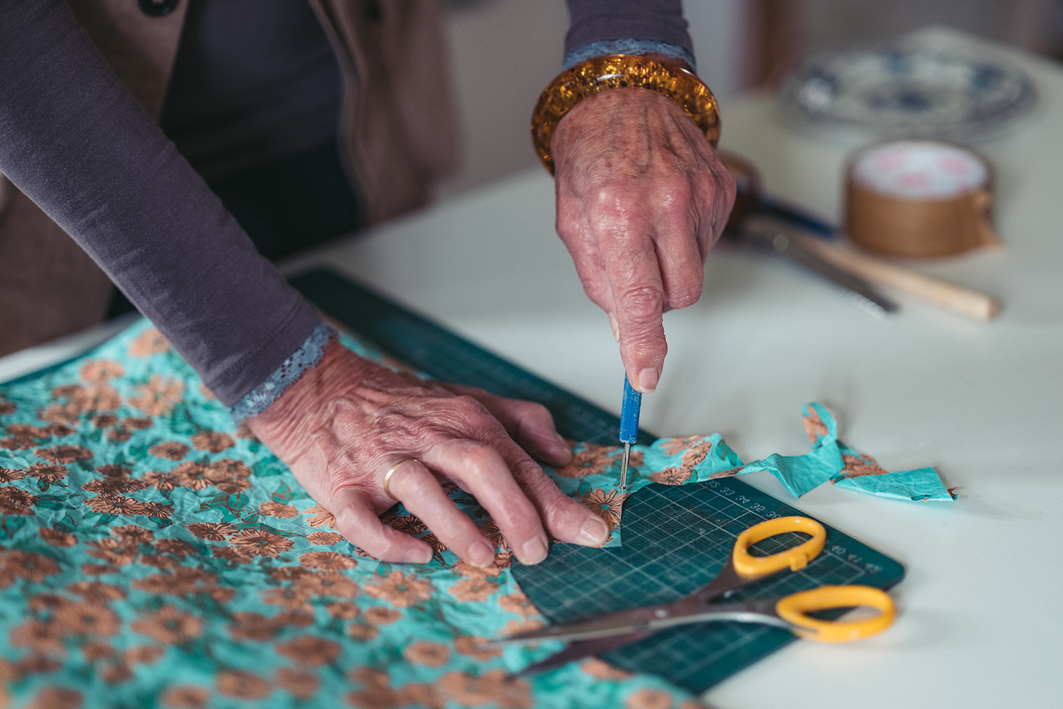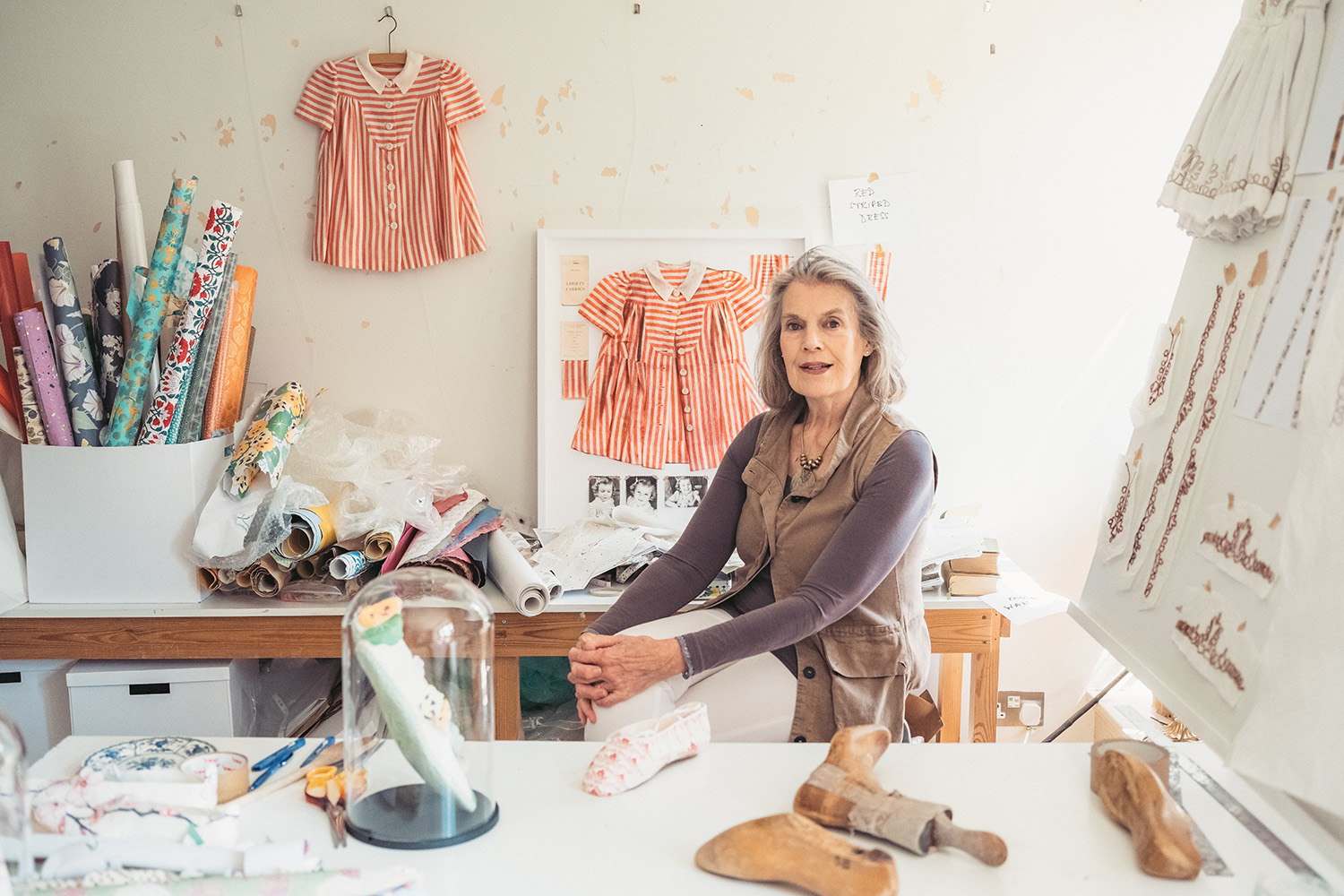 If you compare Liz Valenti’s career to a book, then Sticky Paper Studio is the most recent chapter in a long and exciting story. In the previous chapters, Liz was a student at the Royal College of Art, London, a fashion designer in New York and London, and a lecturer in fashion design in a number of art schools. She even worked with Mary Quant, the inventor of the miniskirt. When she retired, she simply could not stop being creative. So Liz found a new outlet and began working with paper. Since 2010, when she launched her studio, she has been cutting, folding, piercing and glueing paper – in short, she has been using the collage technique to manufacture unique paper garments that cannot be worn, but admired as works of art.