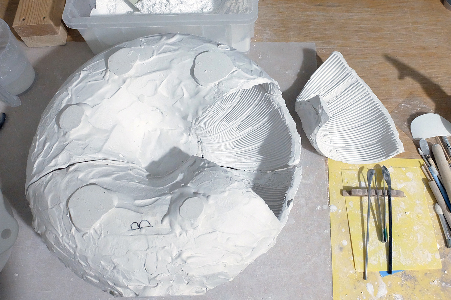 The first step in the overall approach is to make a prototype of the work, usually in clay, but sometimes in other materials. Then the clay prototype is cast in plaster and removed before the glass powder is placed in the moulds. The effect or texture after firing is linked to the way I have spread the glass powder.
