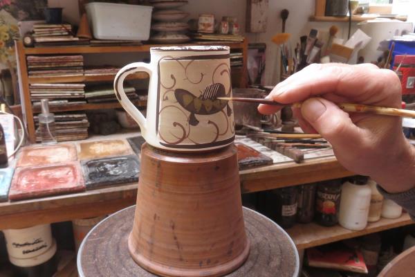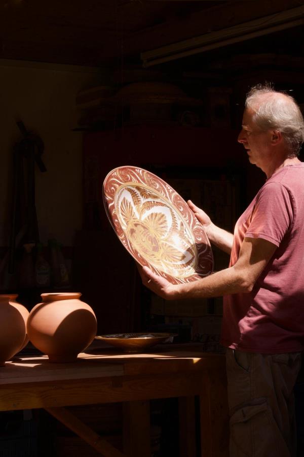 Mark Campden grew up in a creative environment, his mother made sculptural ceramics and his father worked at the renowned Aldermaston Pottery. After his father passed away, he was gifted his notes. These notes allowed Mark to work with lustre firings, a laborious process, but with stunning results. He is one of very few potters working in this way, and, as he explains the steps involved, it is clear why. Each step has to be executed correctly, from creating the forms to work on to making the pigments from copper and silver, from drying the wood (for up to three years) to monitoring the firing to ensure the glowing lustre finish is achieved. Each step requires skills that Mark has built up through experience and he is truly a master of this craft.