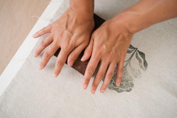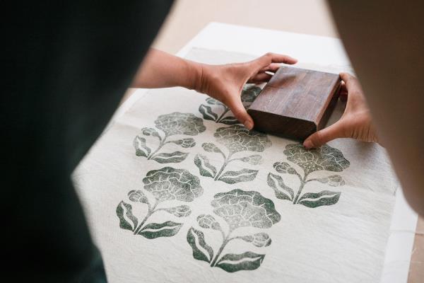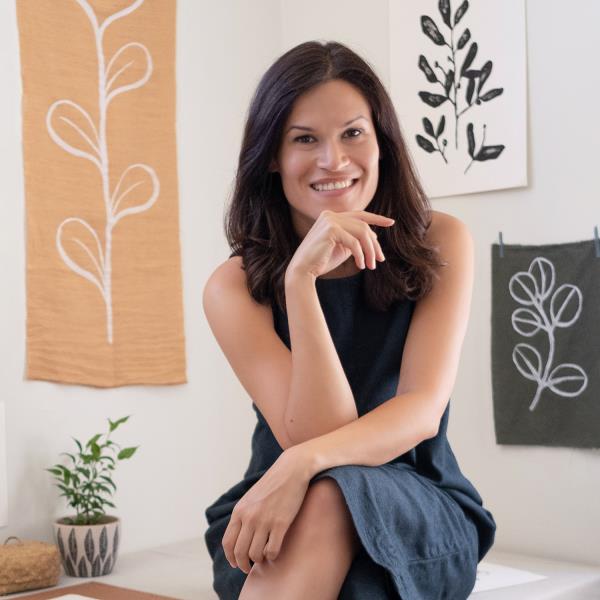 Marta Afonso’s special connection to textiles comes from her grandmother who taught her how to sew. While studying textile design to a post-graduate level she took practical courses in pattern making and garment sewing. It was natural to open her workshop in 2015 to creatively use her knowledge to find her own expression. A trip to India influenced her direction. “I learned the rare block printing technique from a few local artisans and use it in my work with other manual methods such as stencil printing or painting directly onto fabric.” Marta’s hands are creating from the initial drawing all the way to the manual pressure applied to the textile. Sensitive to transmission, she runs workshops to show how fabric can be a canvas for boundless imagination.