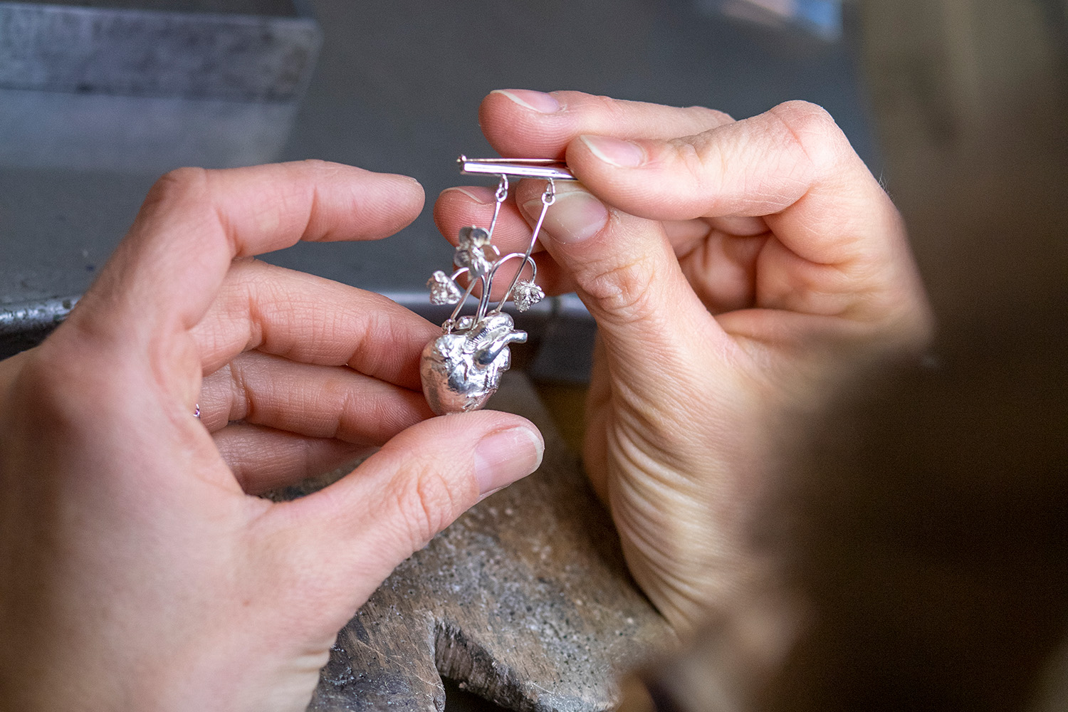 Martina Lončar is a jewellery designer from Ljubljana. Her craft story began when she was 15 and a friend gave her a pair of earrings. She lost one and decided to make a new one. It was in this moment that the spark of her creative fire ignited. After completing her studies in art history, she moved to Italy, honing her skills in fine jewellery making through courses in Milan and Florence. There, she was mentored by renowned artisans like Alessandro Dari and Marco Garezzini. After ten years of living and working in Italy, she moved back to Slovenia and in 2020 opened her own studio in the heart of Ljubljana. Her contemporary designs bring her intimate world to life, unveiling a symphony of opposing elements. Beneath simple forms found in her creations, precious raw materials and intricate mechanisms hide, along with unadorned beauty and a celebration of imperfections. Martina's creativity is fed by ongoing research and an enduring passion for learning.