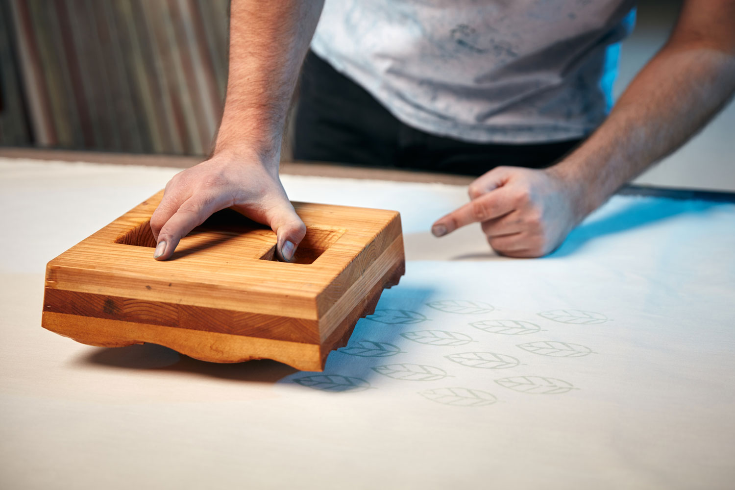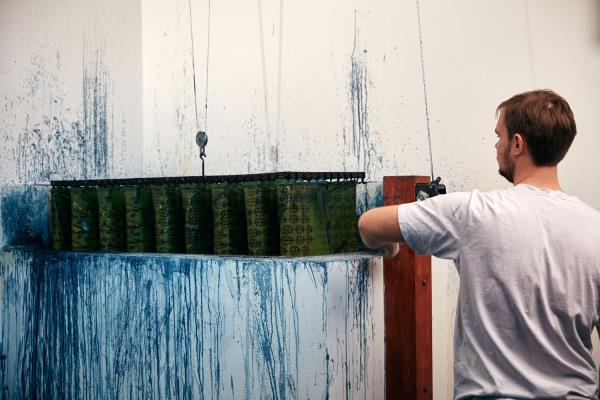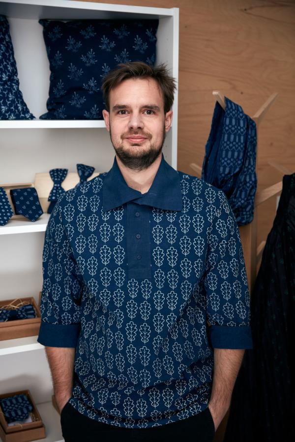 Blueprint attracted Matej Rabada's attention as a student of textile design. He devoted his final thesis to blueprint at a time when no one in the country was working in this craft. During this period he founded his workshop, so he could revive this craft and bring his view and contemporary design. Blueprint currently represents Matej's full-time job, together with his wife Veronika. He makes and creates patterns of blueprints. Veronika designs and creates all sorts of products, such as shirts, dresses, ties, bow ties, and scarves, which are then displayed at shows or delivered to customers. It is the combination of different products that makes their workshop so unique.