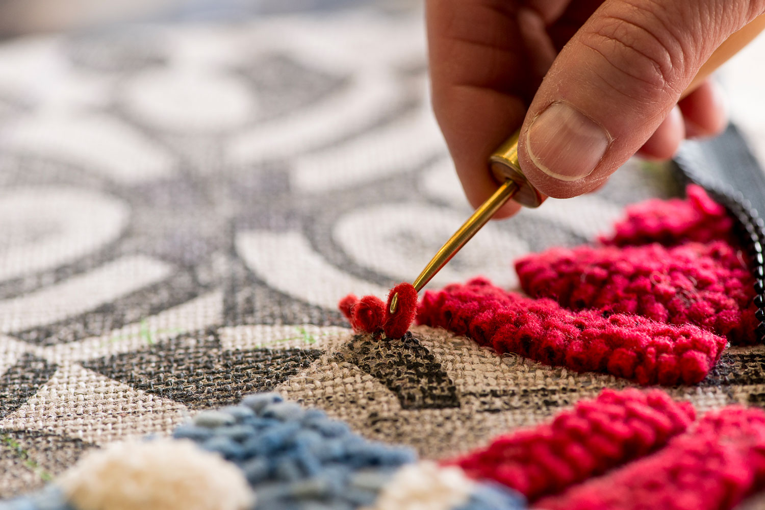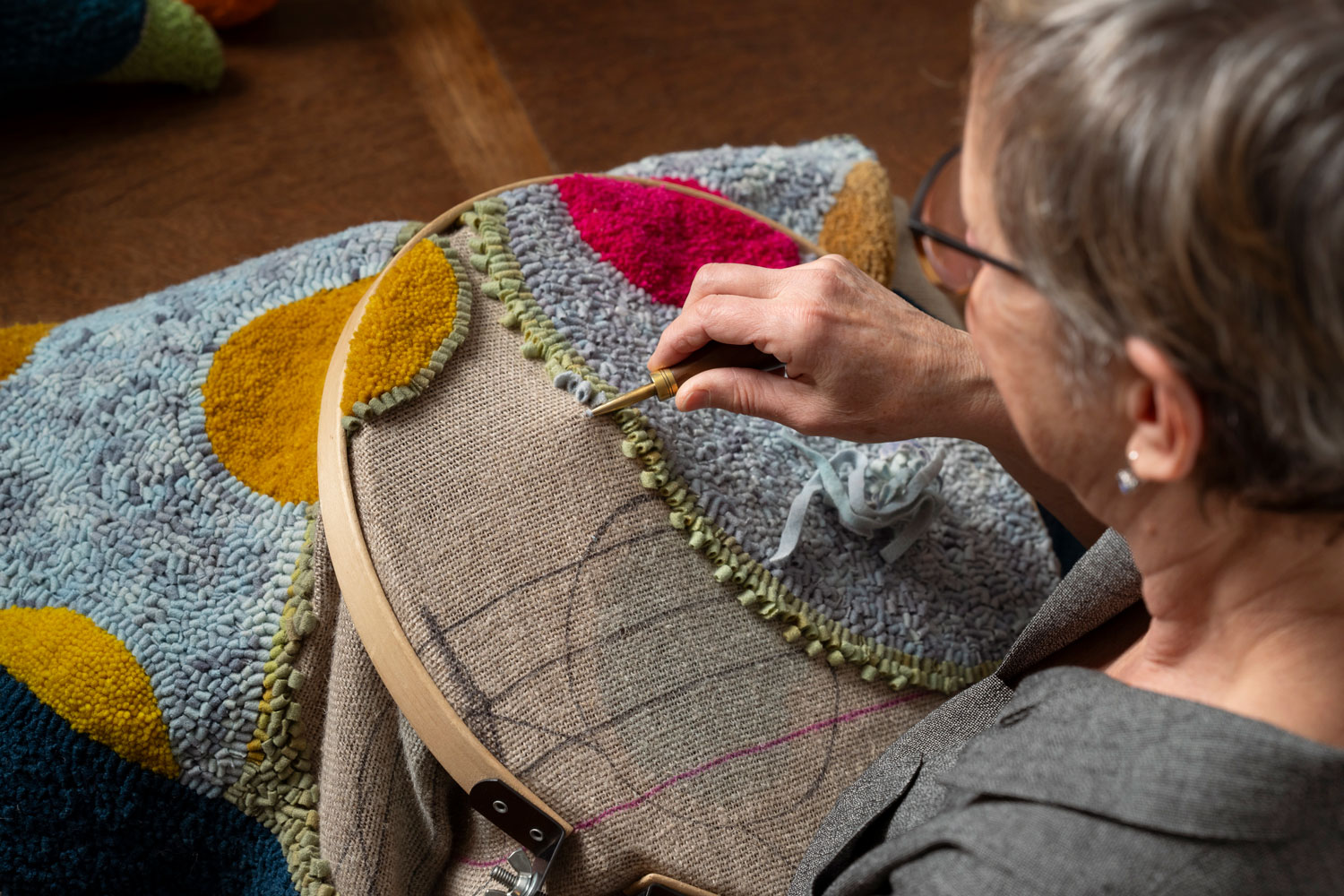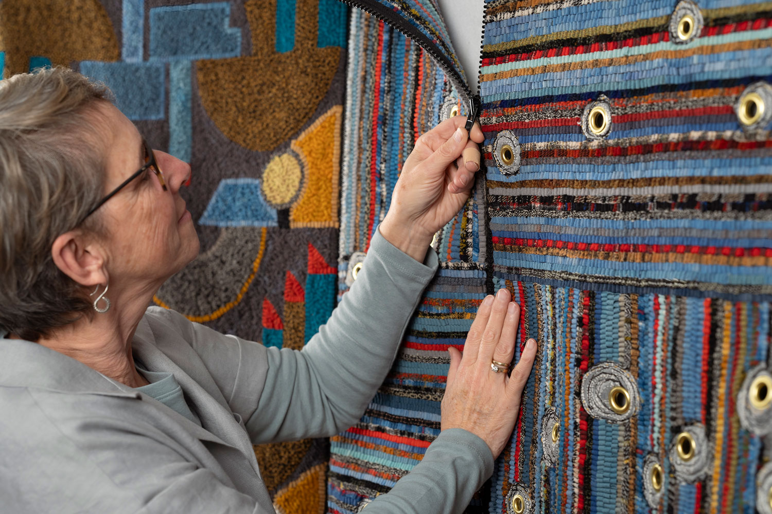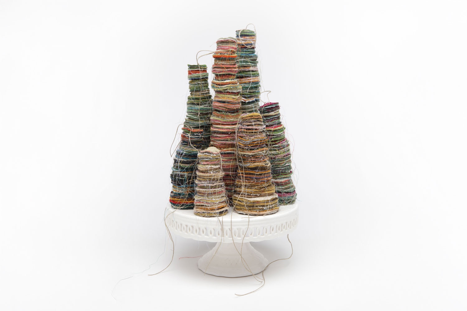 Michelle Sirois Silver creates hand hooked rugs and textile sculptures with a sense of legacy and a link to the environment. Growing up, crafting and making things by hand were part of daily life, and a practical necessity. Michelle initially approached crafting as a hobby, in parallel with a career in broadcasting. “My shift to a professional artistic textile practice came from a need to transform materials into objects,” she says. Using her cultural heritage as a tool for enquiry about personal topics, Michelle began creating functional rugs from reclaimed textiles. Her practice has since expanded to include hand stitching, felting, deconstructed screen printing and the creation of soft 3D forms and sculptures, made with diverse objects and materials such as scales, plates and concrete.