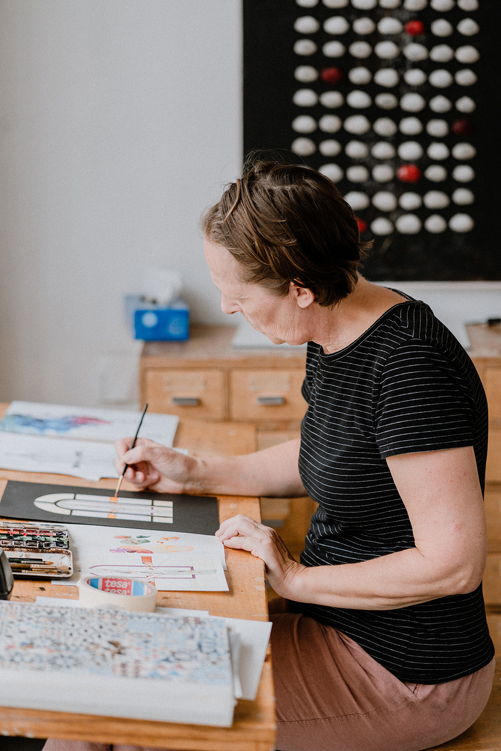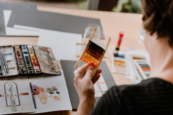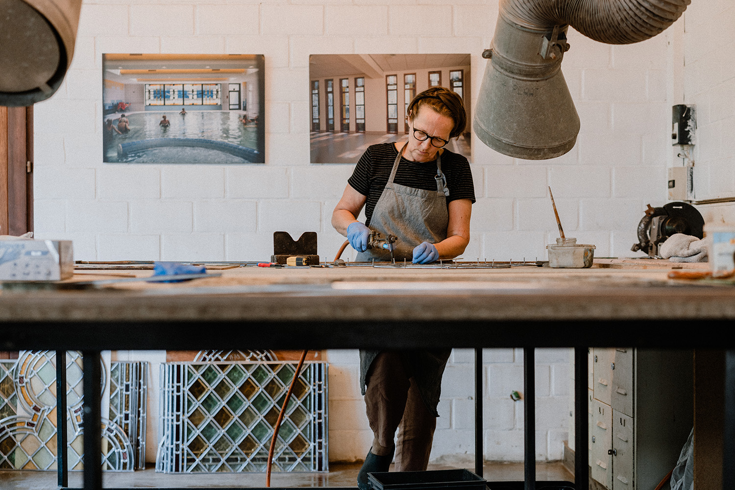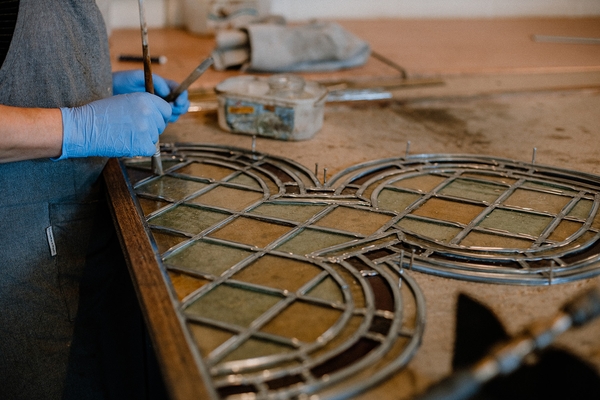 Mieke Verwaetermeulen started working on stained glass in 1985, driven by the desire to work in architecture. “Stained glass offers excellent opportunities to work with light in buildings,” she says. She restores old stained glass windows, but also designs her own contemporary creations. “The one activity enriches the other. Through my work in restoration, I built up the necessary skills and learned to focus on the smallest details, which enhances my creative work. The combination also gives me peace of mind.” Mieke is inspired by observations in nature and is always making sketches with pencil and brush. “Classical drawing and painting are very important to me. I am constantly researching and experimenting, which gives depth to the style of my work.” Her studio, Glaskunst Atrium, is situated in a former train station.