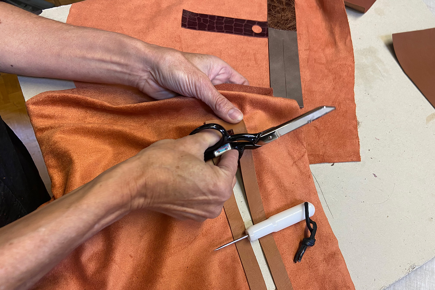 Chris Murner is inspired by the abstract art forms of the early 20th century to work with volumes and colours in the leather goods that she crafts today. Passionate about artistic exploration and crafts, she wanted to express herself with leather, all qualities of leather, and to share her knowledge of this material. The importance of transmission is the other facet of Chris' craftsmanship: mother of two who are themselves craftspeople, Chris is eager to encourage leatherwork and craftsmanship in general. If the fast fashion industry can sometimes lead us to forget what good material is, Chris is there to remind us: a good piece of leather honours the animal, is extremely robust and will last you a lifetime.