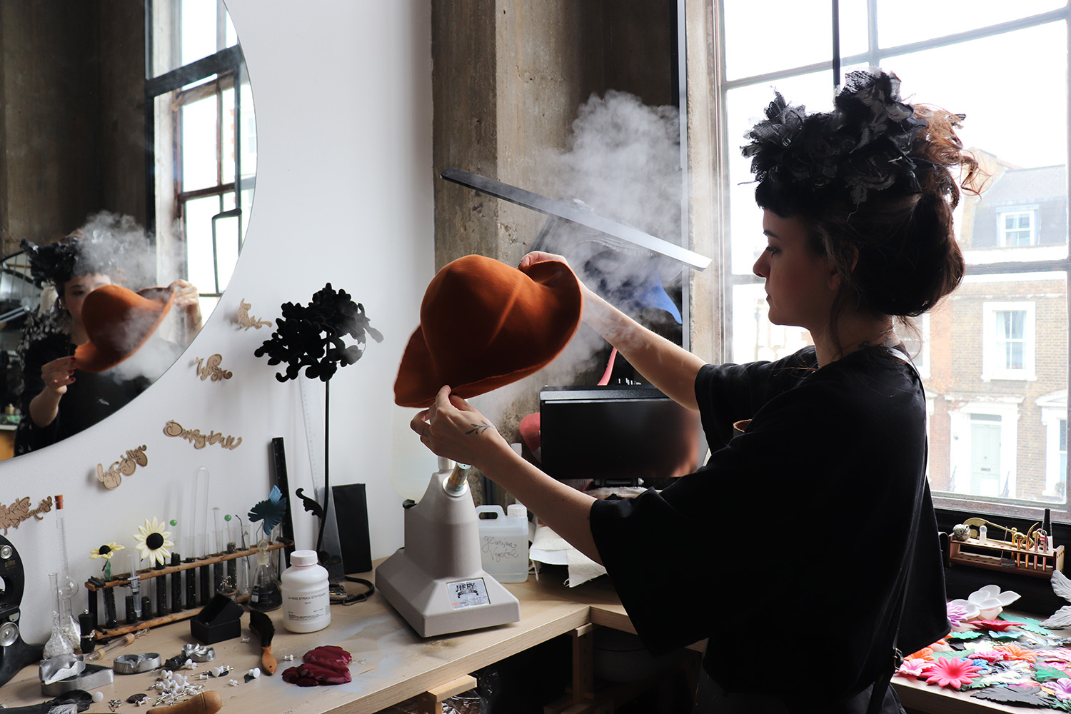 “Hands have a precious spiritual life. They have their own eyes and soul. They are determined, virtuous and refined. They have an innate taste for beauty and the power to transform the ordinary into the sublime.” This is Nikole Tursi’s credo. A master milliner from Argentina, she used to work as a costume designer at the Teatro Colón Opera House. Nikole moved to London in 2019. Fascinated by various tools and crafts, she began her creative journey as a self-taught maker. Her grandmother introduced her to fashion and Cesar Orlando Nuñez, a master craftsman, taught her that “bringing to life what she imagined” was possible. Captivated by how boundaries disappear when it comes to shapes, material or volume, Nikole manipulates and prepares the majority of material she uses, employing techniques and tools from various fields.