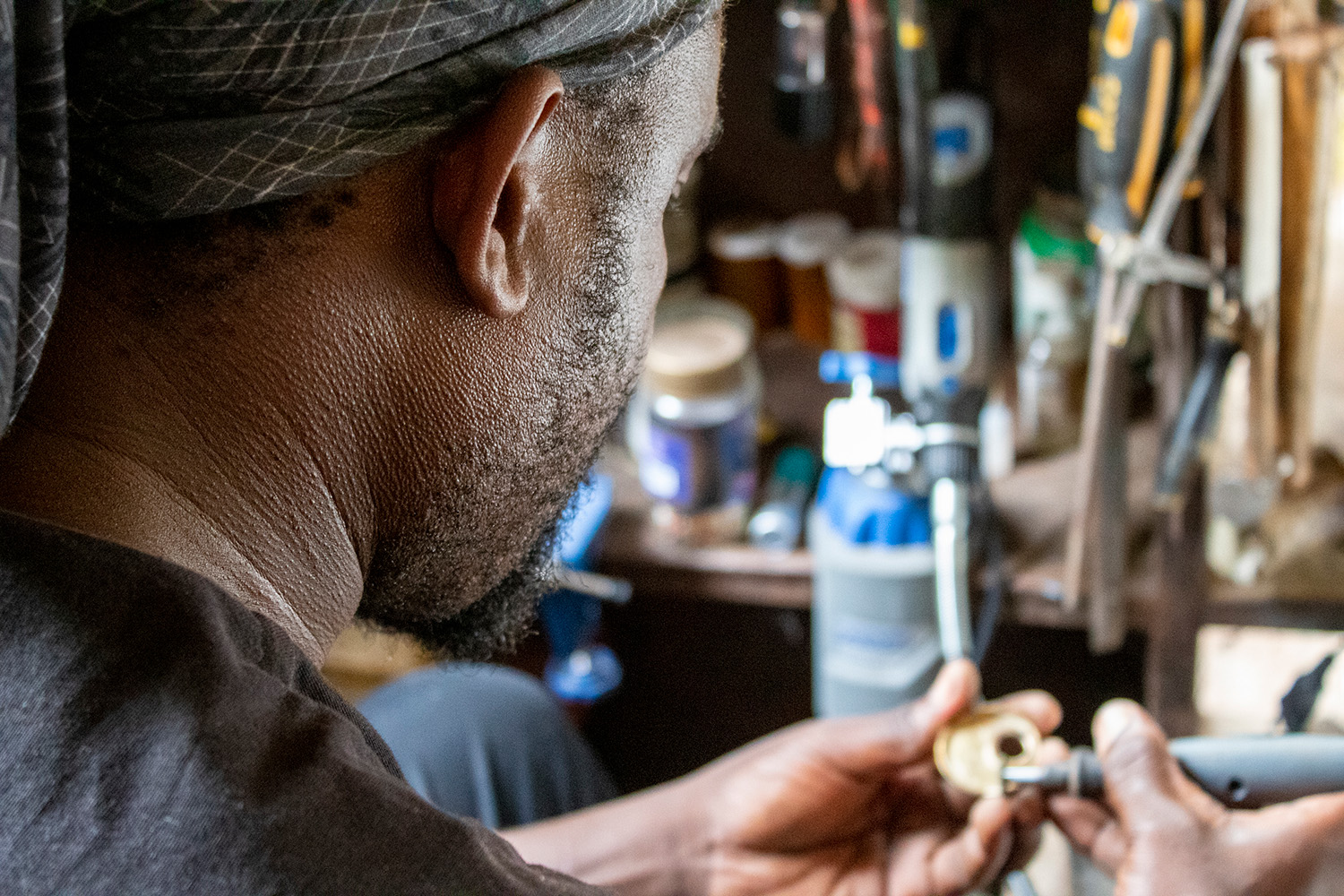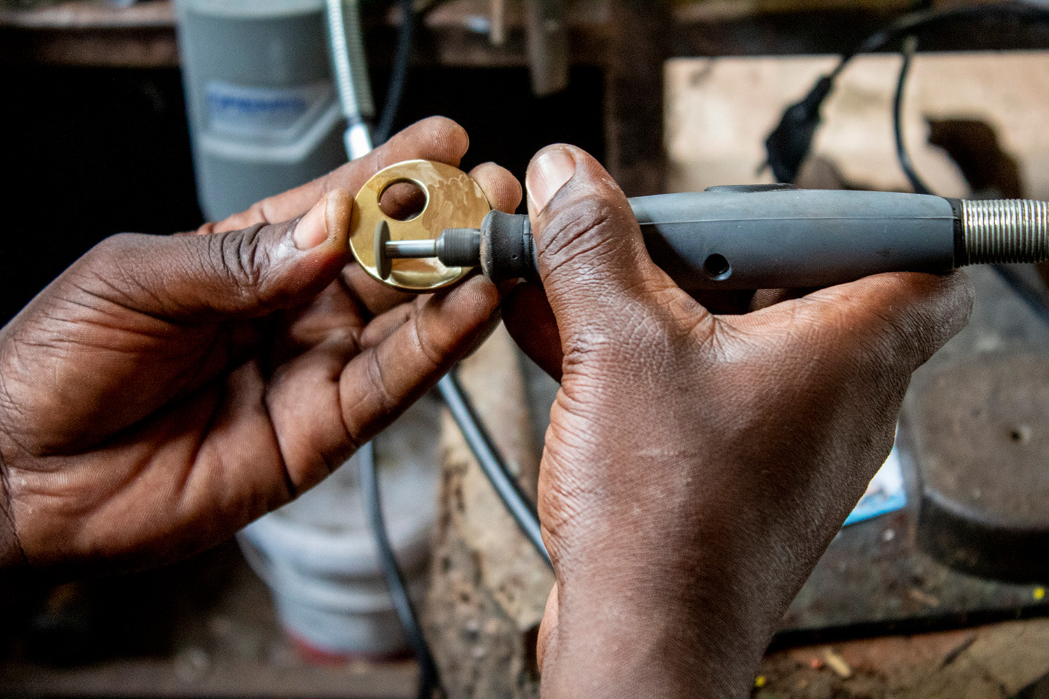 Obert Monga creates objects that have a positive impact on the world. He specialises in micro mosaic jewellery. To achieve this, Obert combines his self-taught technique with the silversmithing skills from his three-year apprenticeship at Ndau Collection in Victoria Falls, where he opened his workshop in 2010. Working in a remote town, traditional supplies are hard to come by, so Obert recycles unwanted hardware metals, repurposes harmful snare wire, and sources materials like gemstones, shells, and ostrich egg shells from the natural world. Through his craft he is contributing to local conservation efforts. “This work is important to me because whenever I find or collect scraps of material, I can bring them to life again. And in so doing, I am helping to clean our environment. The little that I do makes a big difference.”