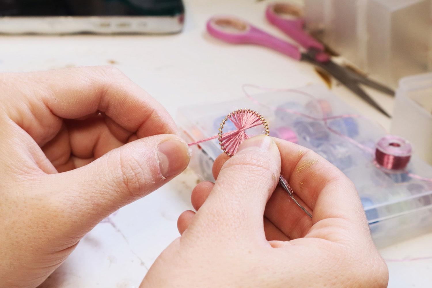 Pablo Ruiz Banús began his practice by creating talc-based artificial flowers, a decorative and religious tradition that has existed in Spain for centuries. “I have always loved nature, and this was a way to explore and deepen my appreciation,” he explains. At first, Pablo stuck to traditional materials like aluminium wire and costume jewellery to craft his floral pieces, which can be found in churches and heritage institutions across the country, from Seville and Madrid to Barcelona. Around 2022, he began widening his cultural lens, looking to places such as Japan and Malta for inspiration. The latter, known for its tradition of flowers made of silk and adorned with elaborate glass beads, motivated Pablo to take his craft to the next level by sourcing fine fabrics, gold and silver beads, coral fragments and gemstones from Europe and Asia.