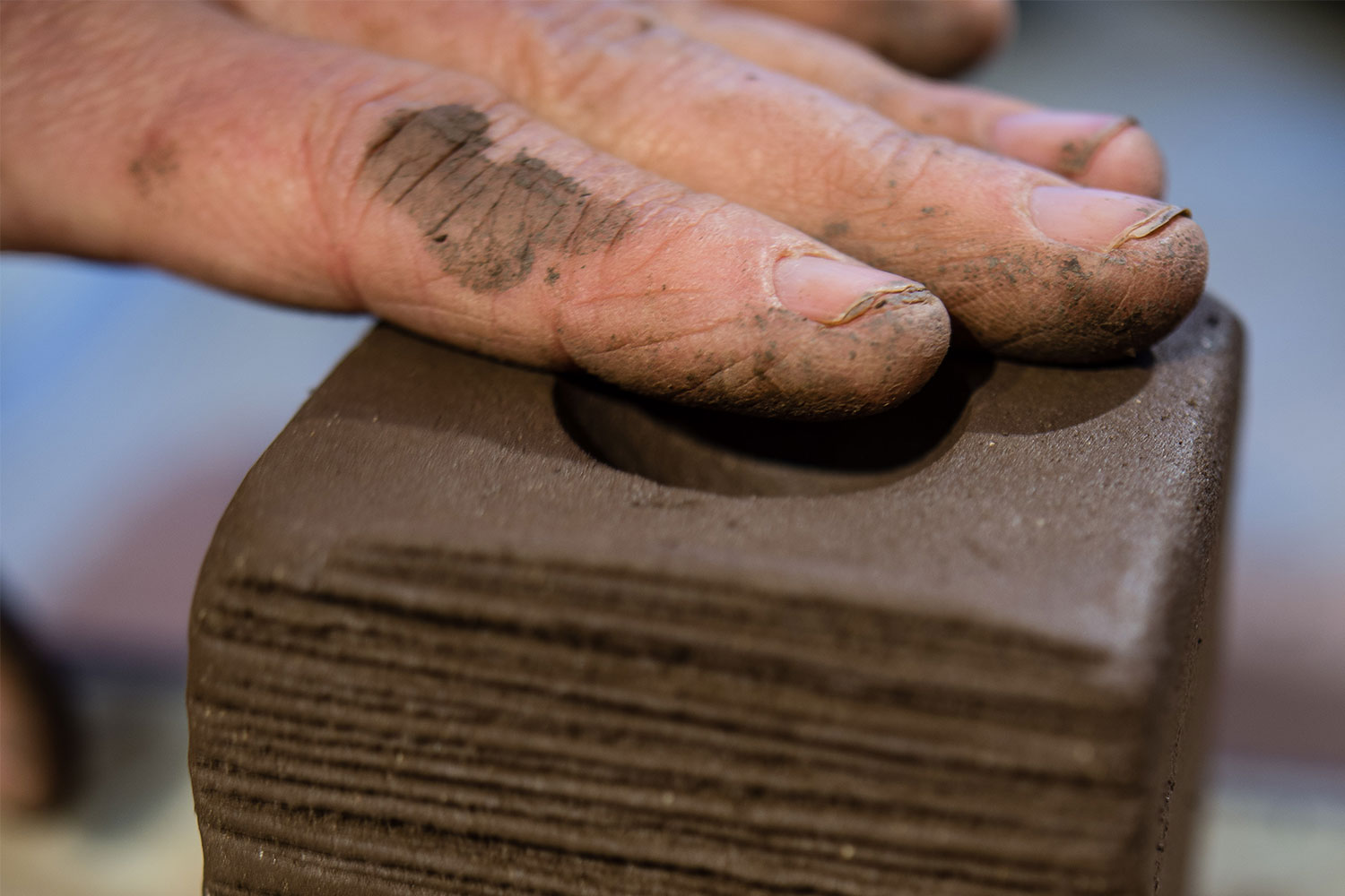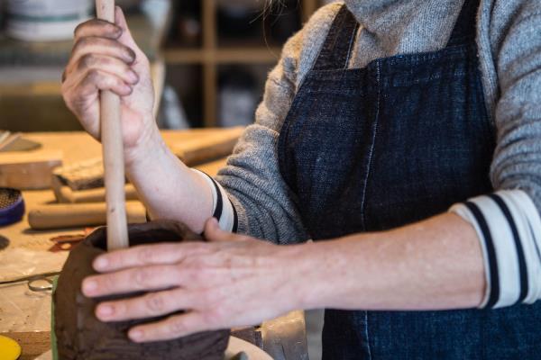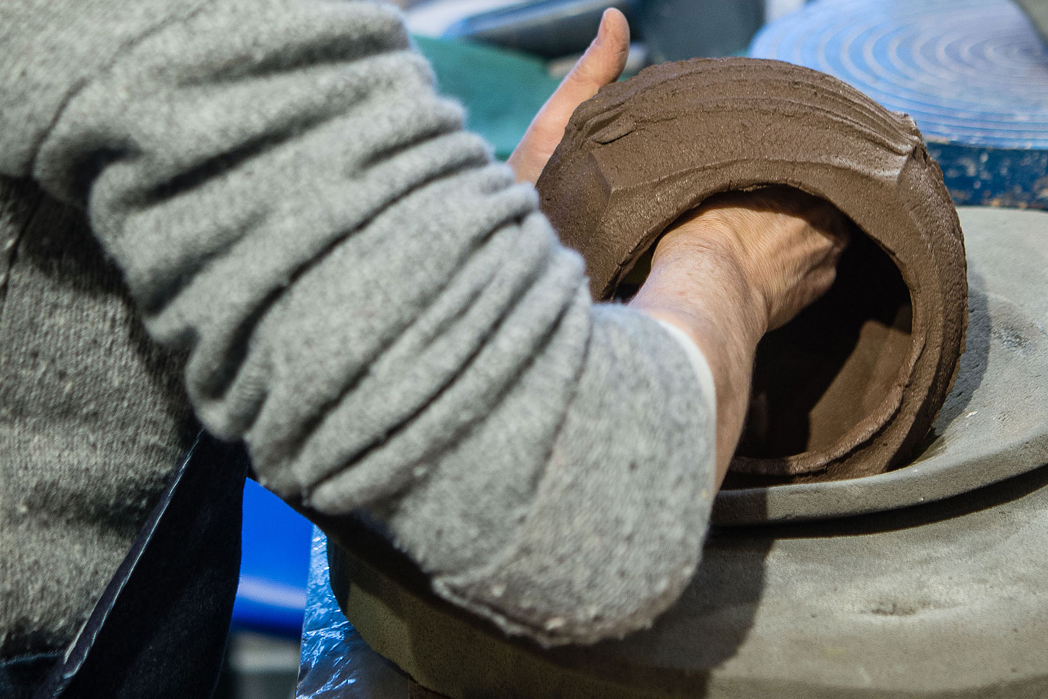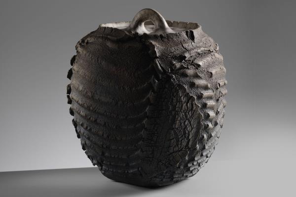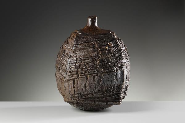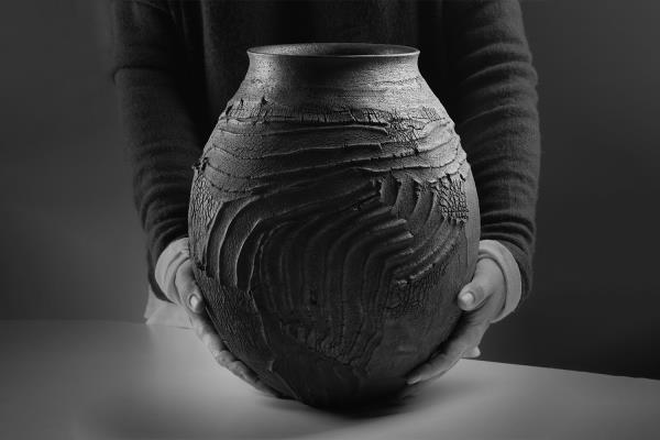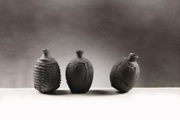 Patricia Shone had two early passions: ceramics and cooking. Though she took a degree in ceramic design, her career initially centred on cooking, and she worked as a chef in top restaurants in the UK and Italy. One particular job took her to the Isle of Skye, where she met her now husband, and the couple have remained on the island ever since. Her cheffing career proved less enduring, however, as she soon decided she needed a change. “So I stopped working and started playing with clay again”. Her husband helped her build a small Raku kiln out of an oil drum, and she gradually got back into firing. She now makes vessels inspired by the textures of the wild landscapes around her on Skye.