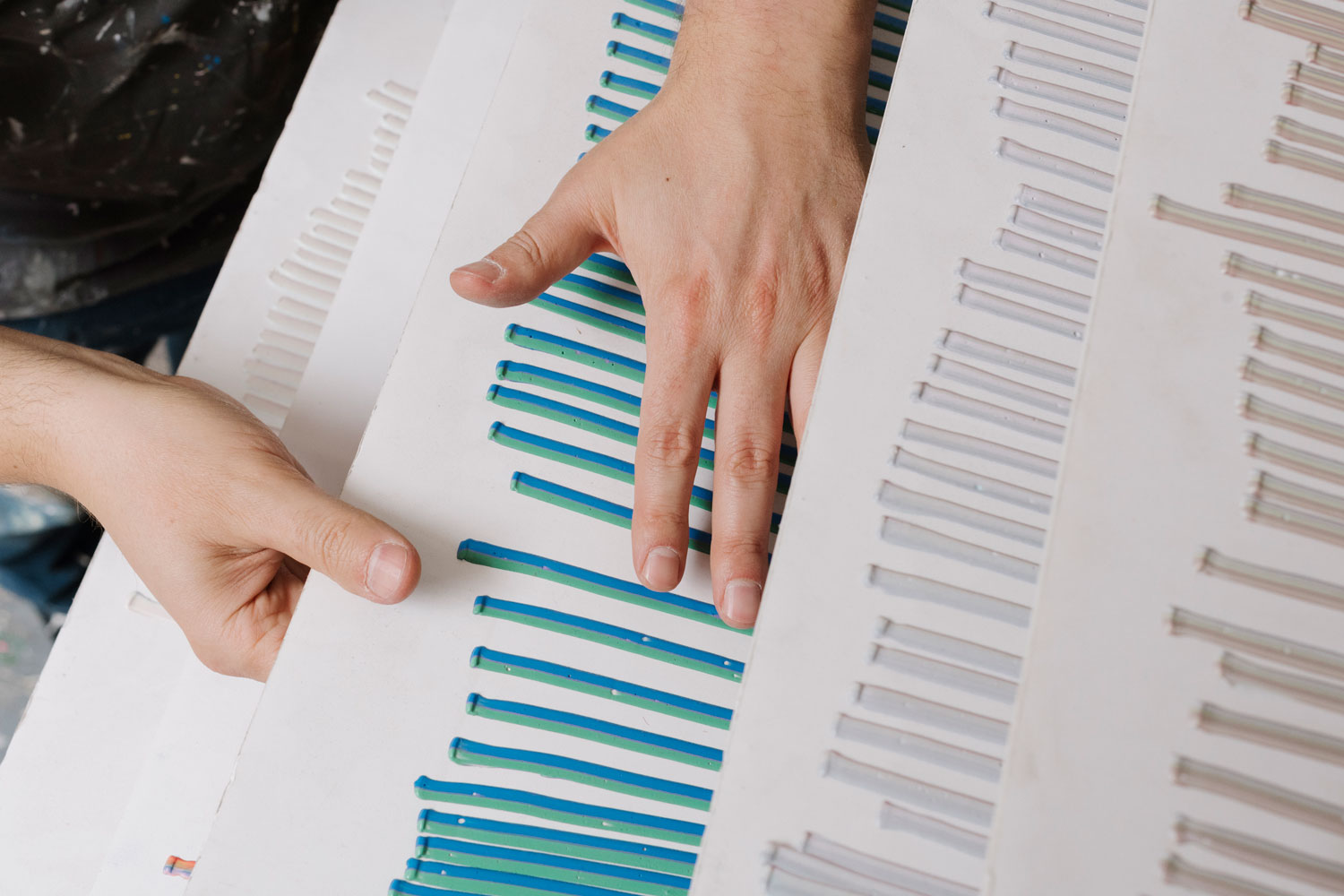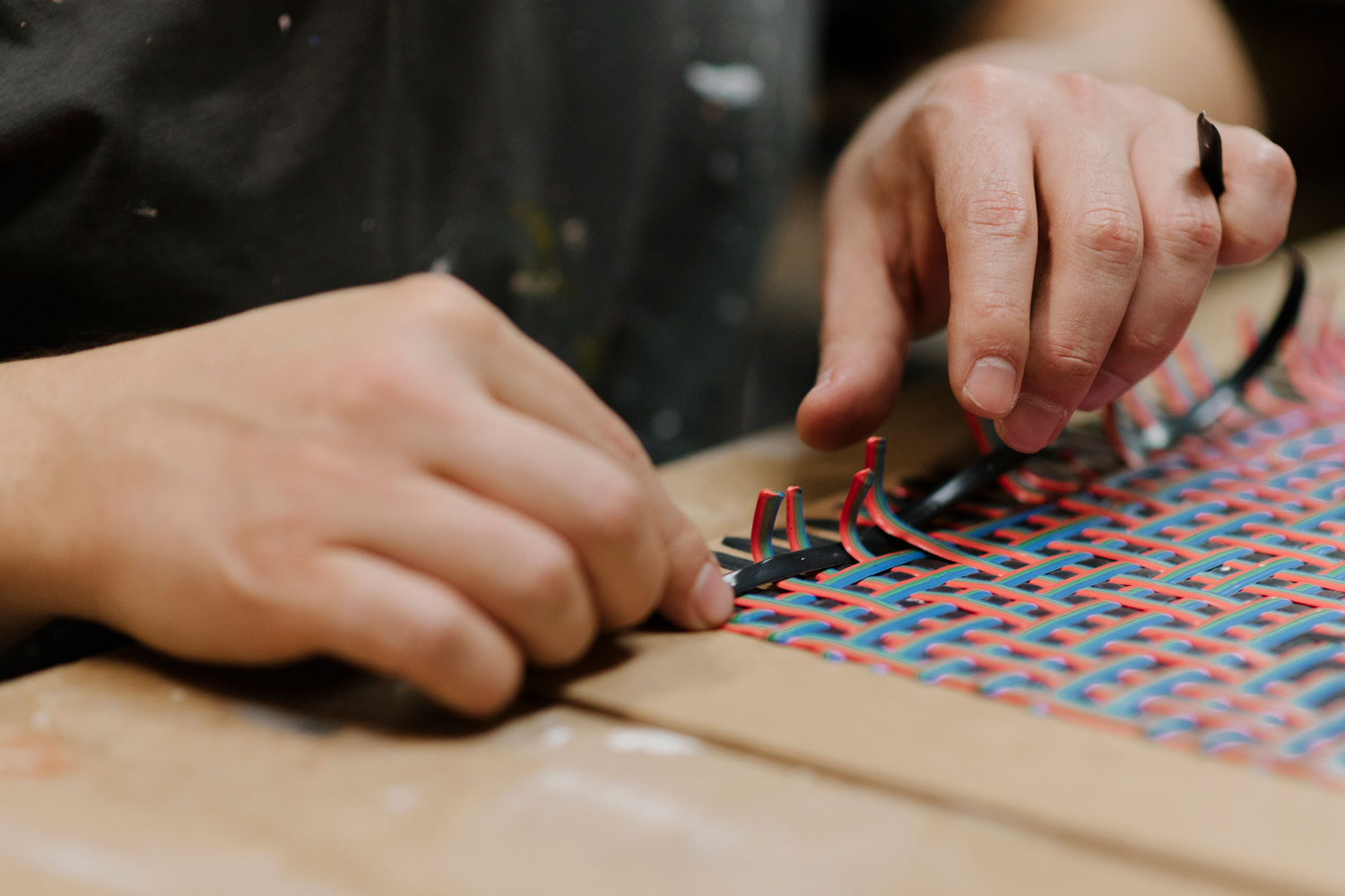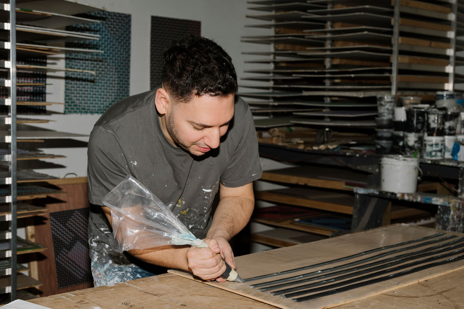 Robert Davidovitz specialises in paint weaving, a unique technique of weaving piped paint on a table using adapted looming techniques. "Born into a family of makers, I was always interested in art, even as a child," he says. In 2006, while studying painting and photography at York University and working part-time as a pastry maker, he was inspired to explore paint and painting in a whole new way. “I had this eureka moment,” he recalls. “I wondered, what if, instead of piping icing, I piped paint, and put it on a canvas?” The insight led him to experiment with creating multicoloured acrylic paint strands and weaving them into works that, by 2010, would feature intricate optical effects and strong elements of tactility and relief. Robert’s practice involves digital tools such as AutoCAD and analogue tools like mixing bowls and spatulas. "My current workshop resembles a bakery,” he says.