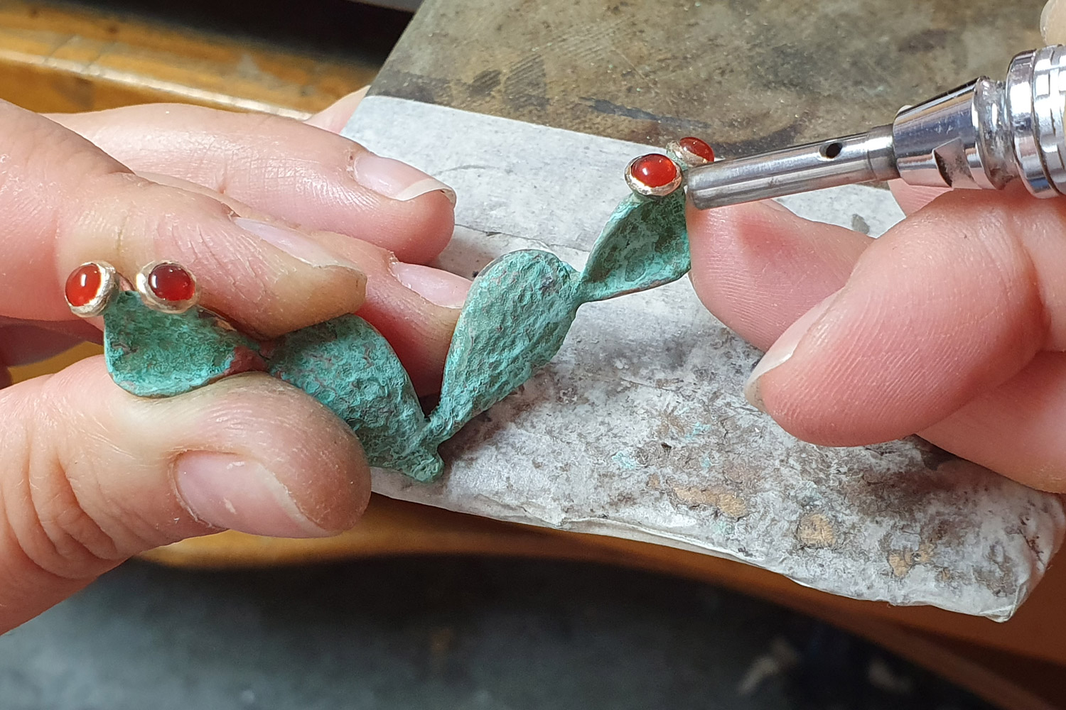 Roberta Risolo’s creations reflect the skills of her hands, the delicacy of her soul and the values of her land. Curious and passionate about jewellery ever since she was a child, she spent several years in Vicenza, one of the capitals of goldsmithing in Italy, to learn techniques from the masters, but then she felt the urgency to develop her own language. She found it in Otranto, her hometown in southern Italy, which is not just a town full of arts and history, but also the most eastern town in Italy: a gateway onto the sea, open to the rest of the world. Her pieces tell stories of brotherhood and dialogue between people and cultures and all of them stem from a real emotion that she wants to transmit.