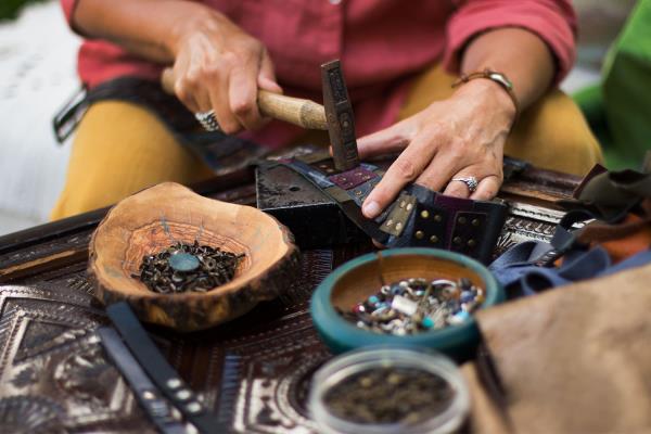 Samira Salihagić's work is a medley of colours, motifs and shapes. Her pieces incorporate the many things that inspire her on a daily basis. Twenty years ago, Samira suddenly lost her job and – having plenty of time on her hands – began touring craft shops throughout Sarajevo. She was amazed at how master artisans made beautiful items with their hands, she wanted to learn to do the same. At first it was jewellery, but as she mastered the craft she started making bags. Although she still makes jewellery and belts, even leather shoes and dresses, bags are what she always comes back to.