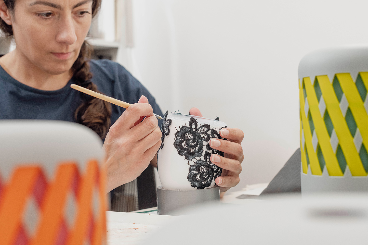 Often the material is mistaken for ceramics as I use a lot of opaque glass. People are surprised when I tell them I draw the patterns and cut the stencils by hand, they assume I use computer-aided plotters and vinyl cutters.