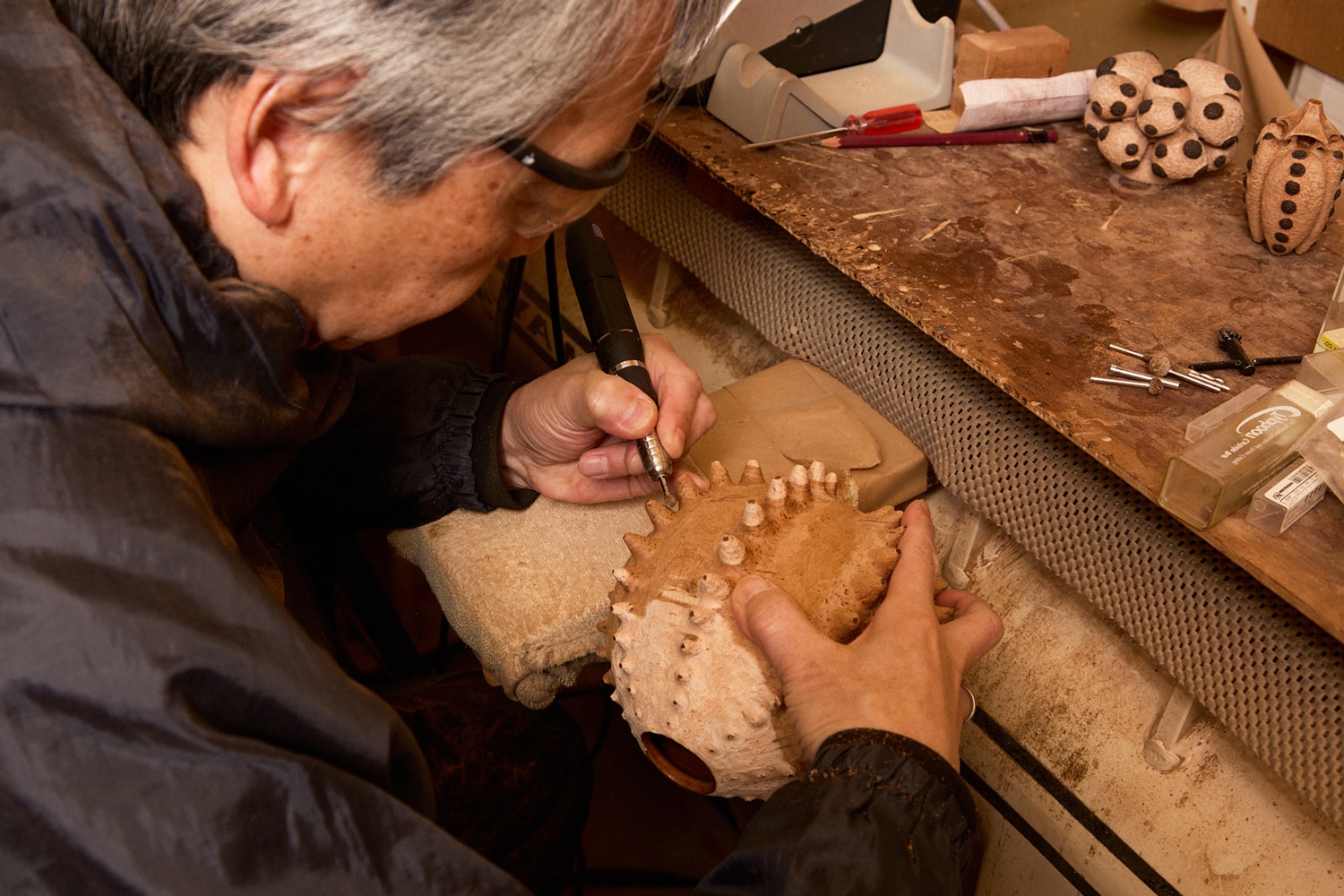 Satoshi Fujinuma translates memories of textures, organic forms and mysterious living elements into abstract wooden sculptures. Trained in environmental chemistry and formerly a ceramics engineer, he later studied woodworking and developed his woodturning skills independently. "During an exhibition in the USA, I discovered abstract sculptures created through woodturning. This broadened my vision far beyond utilitarian objects," he says. Based in Tokyo, Satoshi draws inspiration from his encounters with nature. He transforms seemingly insignificant forms of life into works of art, using woodturning, carving and pyrography. Each angle of Satoshi's hybrid creations, oscillating between underwater plants and seed clusters, reveals a different facet, defying classification.