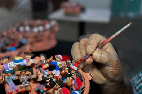 Saúl Valero has been a master ceramicist of Ráquira for more than 30 years, he is recognised worldwide for his decorative bullring creations. Saúl started working with clay at a very young age, inspired by the animals and landscapes of Ráquira. He believes that his workshop has evolved thanks to his taste for creativity and his constant search for innovation in materials and techniques. The first objects he made in clay were representations of cows, chickens, bulls, donkeys, and traditional Colombian peasant people. It takes approximately three months for Saúl to create a 50 x 25 cm piece. In a bullring with these dimensions, there are approximately 180 unique characters that once dry, Saúl paints with great detail, heart, and colour.