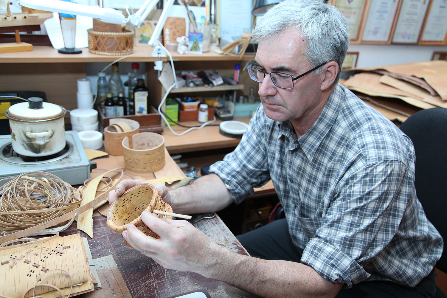 Sergei Korotchenya has always admired traditional birch bark crafts, which first emerged in the Urals back in the 17th century, originally practiced by Old Believers. It wasn’t until he came across a stunning piece during a cranberry picking trip back in the late 1980s that he actually decided to try and make one himself. "It was pure chance: I went to the forest with a friend, and saw a guy with a fabulous traditional 'korob' - a casket with a lid, made of birch bark", he recalls. From then he started learning how to harvest and preserve the material and work with it. A self-taught artisan, Sergei soon developed his own style and evolved into one of the region’s leading birch bark weavers, as a second career. His works are now on show at the Sunny Birch Bark Museum, founded by Sergei in 2019.