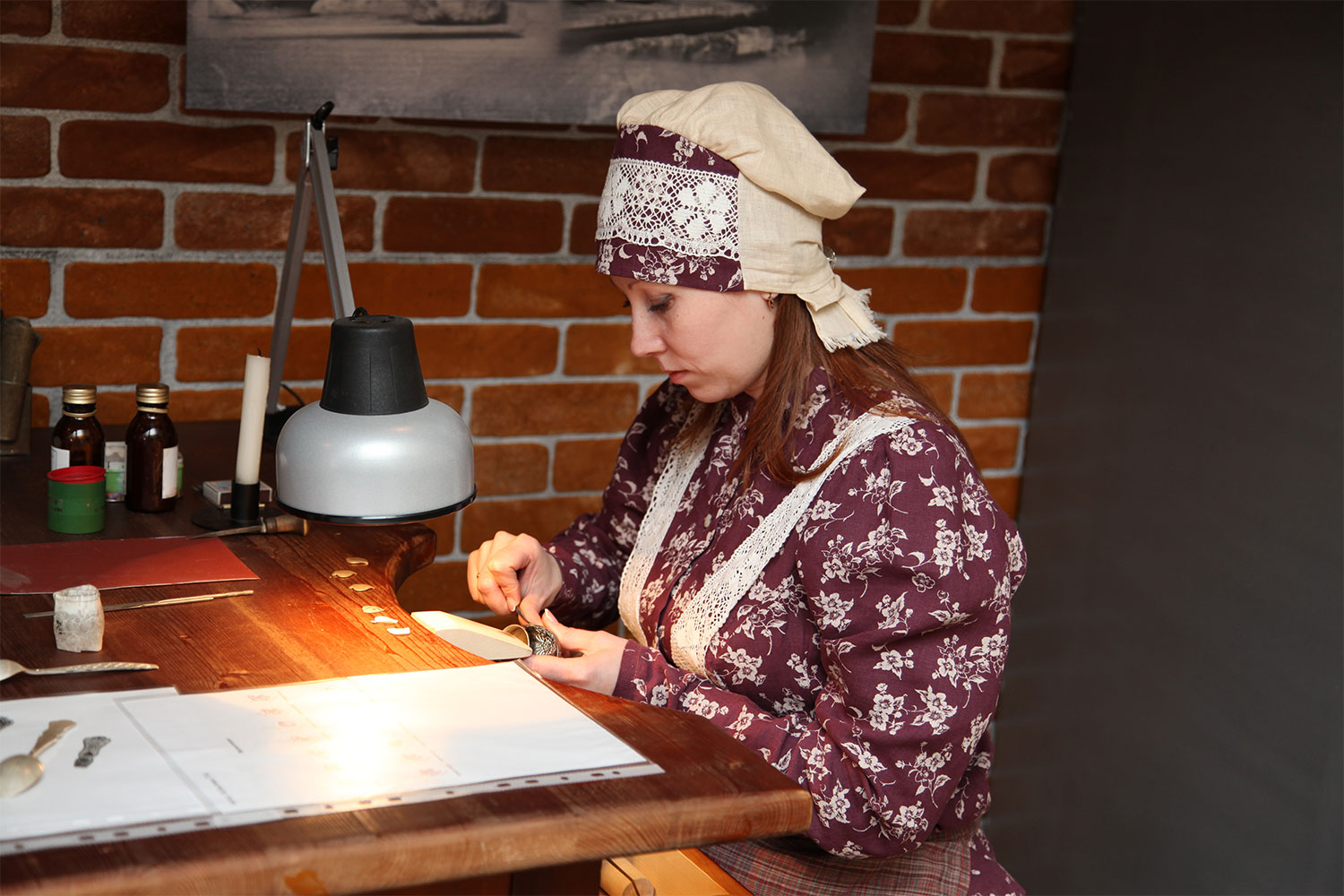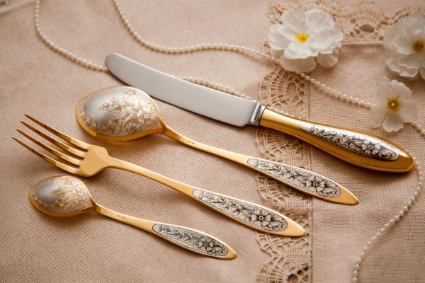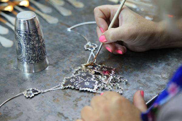 The silver blackening craft originally developed in Russia back in the 17th century, and eventually became synonymous with the town of Veliky Ustyug in the north of Russia. The manufacturer follows in the footsteps of ancient traditions and is renowned for its intricate signature patterns, meticulous craftsmanship, and austere shapes. The collection is impressive and features around 2000 products, all made in 925-grade silver, from tableware and jewellery to religious items. The silver blackening technique used by the local silversmiths dates back at least three centuries and is known as niello. The masters use niello - a special metallic alloy made with sulphur - to decorate the surface of the silver items.