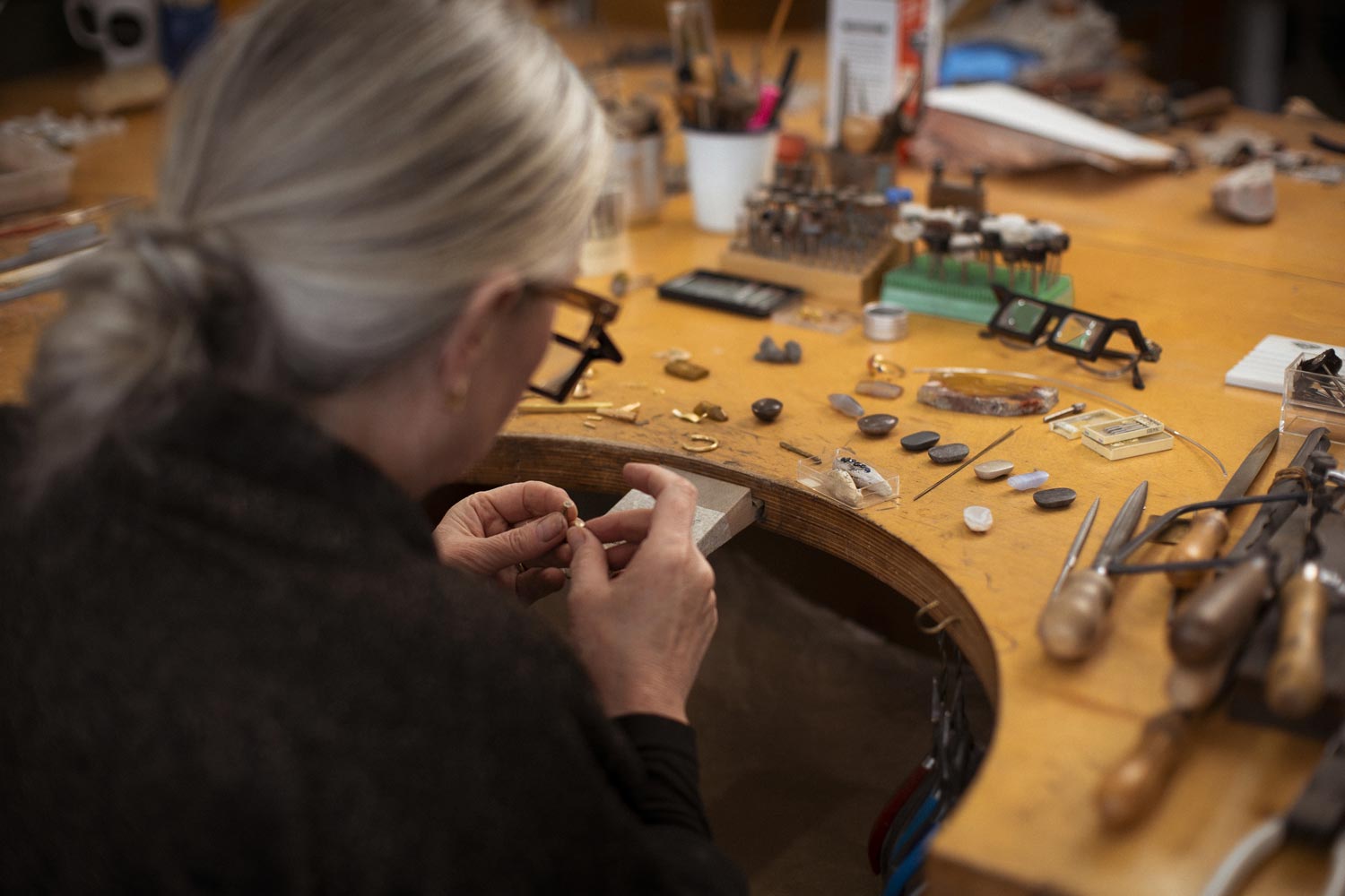 Sian Evans fell in love with the craft when visiting museums filled with archeological jewellery as a child. She went on to become a student of the master stone carver Charlotte De Syllas, who taught her lapidary techniques. Sian is a tireless innovator and perpetual researcher, resulting in contemporary pieces that are truly unique and mesmerising. While she draws on ancient techniques to create her jewellery, Sian also brings her own creative magic to the process. Her inspirations lie in a variety of places: European and British Archaeology, the geology of Britain, botanical structures of plants from 18th-century drawings and medieval goldsmith carvings. Sian carefully studies the past and marries it with the modern-day capabilities of technology.