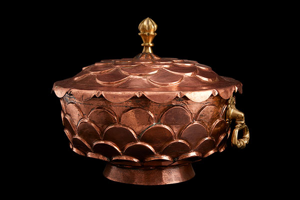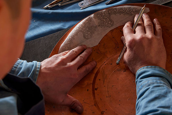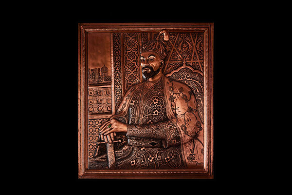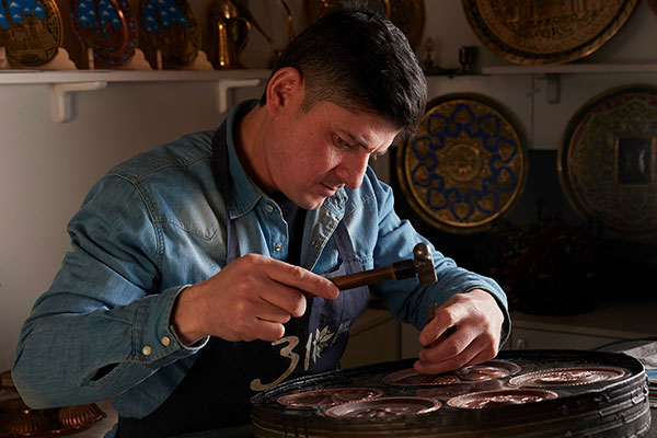 Jurabek Sidikov took up embossing from his mother, who practised it herself. Conscious of her young boy's desire to study this ancient craft, she brought him to master Rakhmat Ruziev who taught him everything. Jurabek learned how to work with different metals and different tools, how to develop patterns and how to use them for different types of finished works. Today he creates various objects, from decorative panels to vessels, trays and jewellery. He covers them with traditional abstract ornaments, floral patterns, ayahs, figurative images. Jurabek says that some of the ideas for future work come to him in his dreams – and he follows these visions, trusting that they come to him from the richness of life.