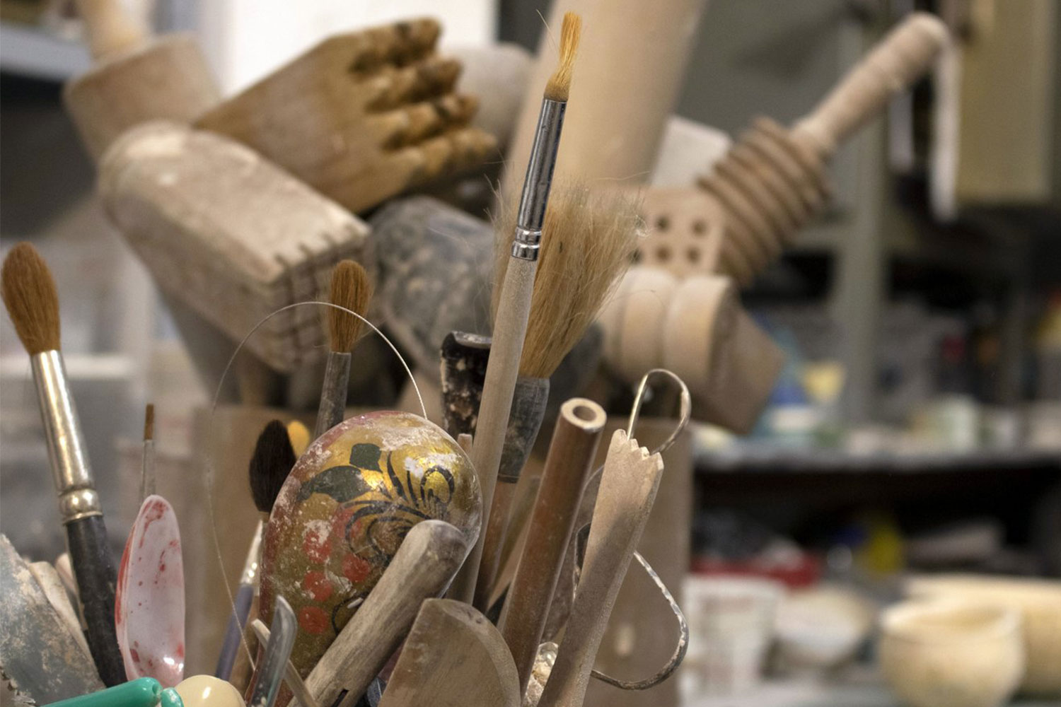 Once I step inside my workshop, I play music, sit down to drink my coffee in peace and decide what to start with. The tools around me are just ordinary things; I'm open to using just about anything that seems appropriate, such as found pieces of tyres, graters, sandpaper, nets, toys…