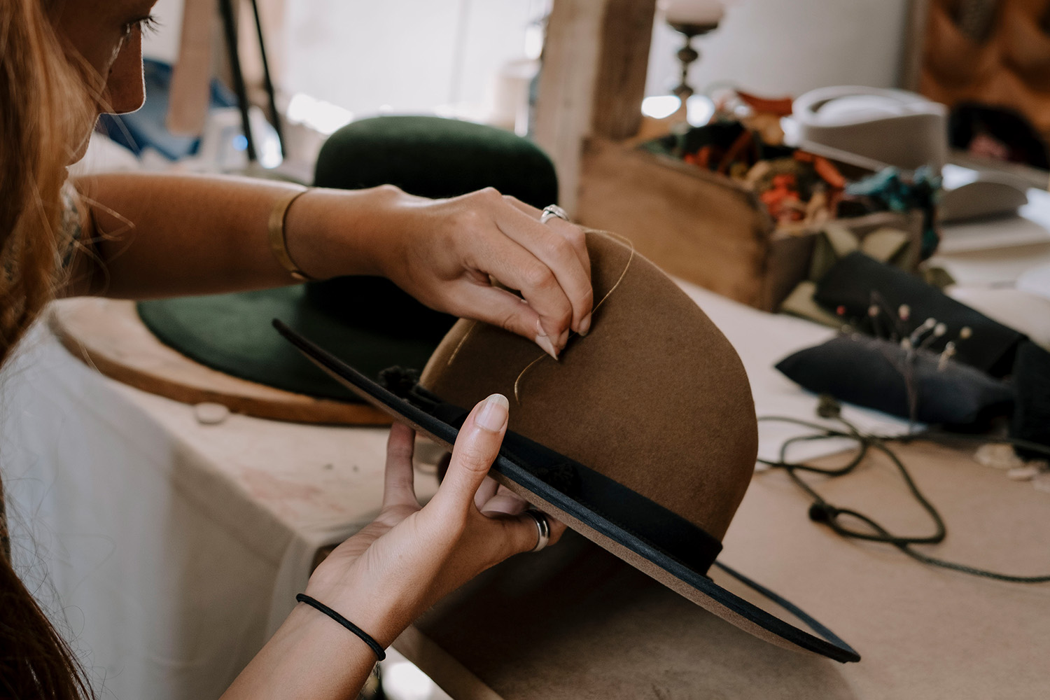 Sofia Caldas studied painting but was drawn to the world of traditional hat making when working as an assistant in a hat shop. "I did not see the making process of the hats that were in this shop as they came from a manufacturer. I believed it was possible to do more than what I saw and became curious to experiment with shaping the felt myself.” Crafting her own artistic path in millinery, Sofia believed in learning traditional hat making techniques while experimenting with shapes and exploring new materials like wood and stone sheets. Today, each hat she makes becomes a wearable canvas used to tell a unique story. Her beautifully-finished and sculptural hats may also contain messages hidden within the piece, or even house a music box to brighten the day of the wearer.
