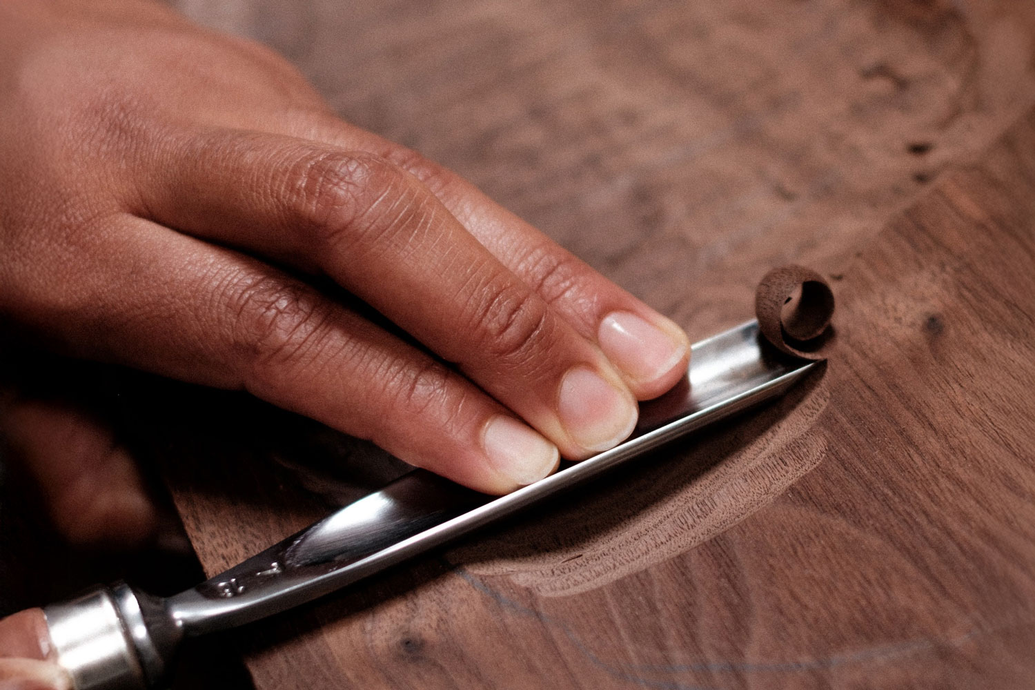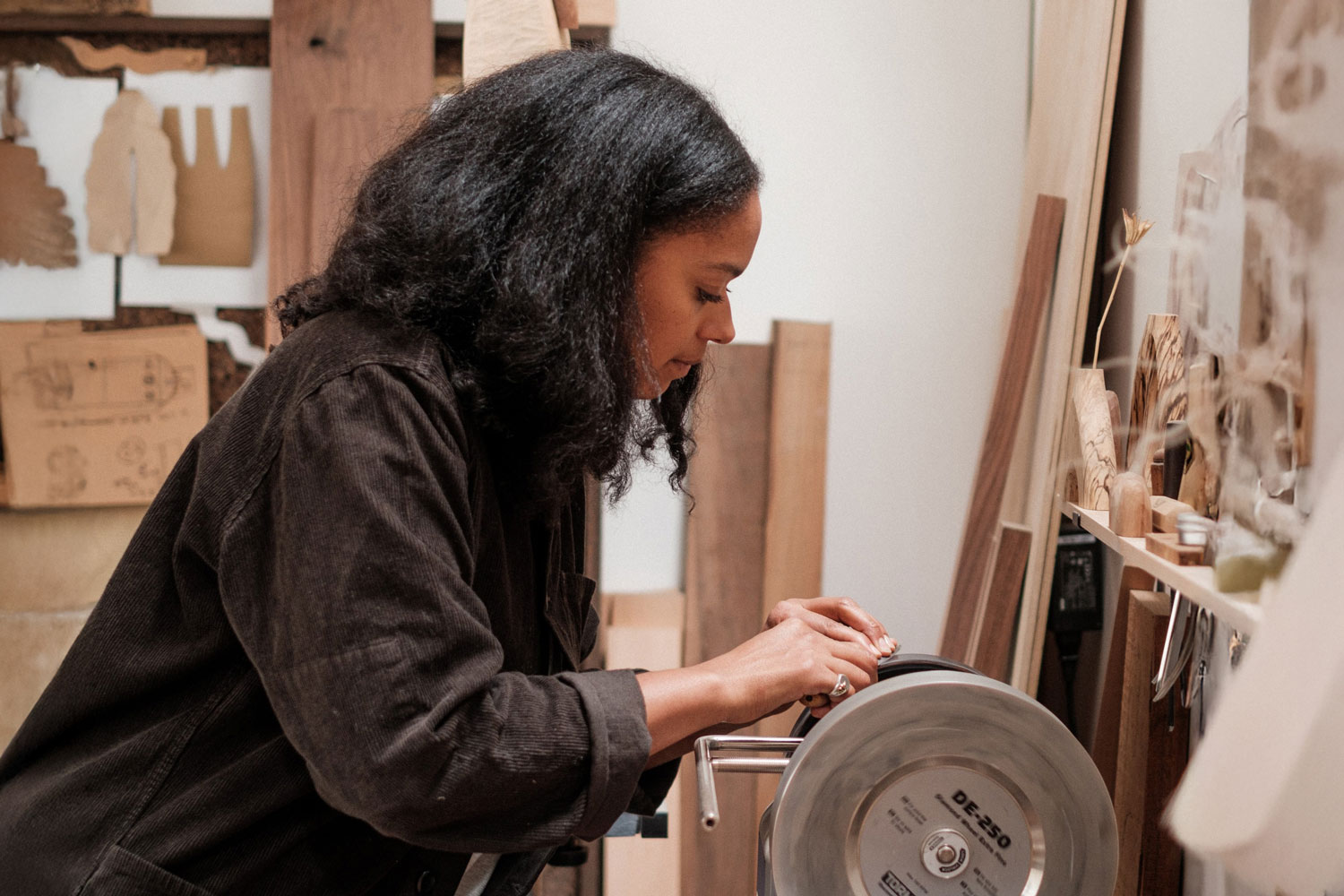 Sophie Sellu creates functional objects and wall pieces carved from British woods in New Cross, London. Before becoming a maker, she studied interior design and worked in visual merchandising and trend forecasting. "While I loved the research process, I found myself drawn to hands-on making," she says. In 2013, a workshop led Sophie to the Sussex woods, where she carved a spoon with rudimentary tools, surrounded by nature. "I found a sense of peace that I had never experienced in other creative outlets," she explains. When a redundancy offered Sophie the time to make, she gave herself six months to establish a practice. After securing a loan from the Prince's Trust, she began selling hand carved tableware at markets. "I only make things I would want to have in my own home," Sophie says. She maintains this one principle in her collaborations, such as in her recent work with furniture company Made.