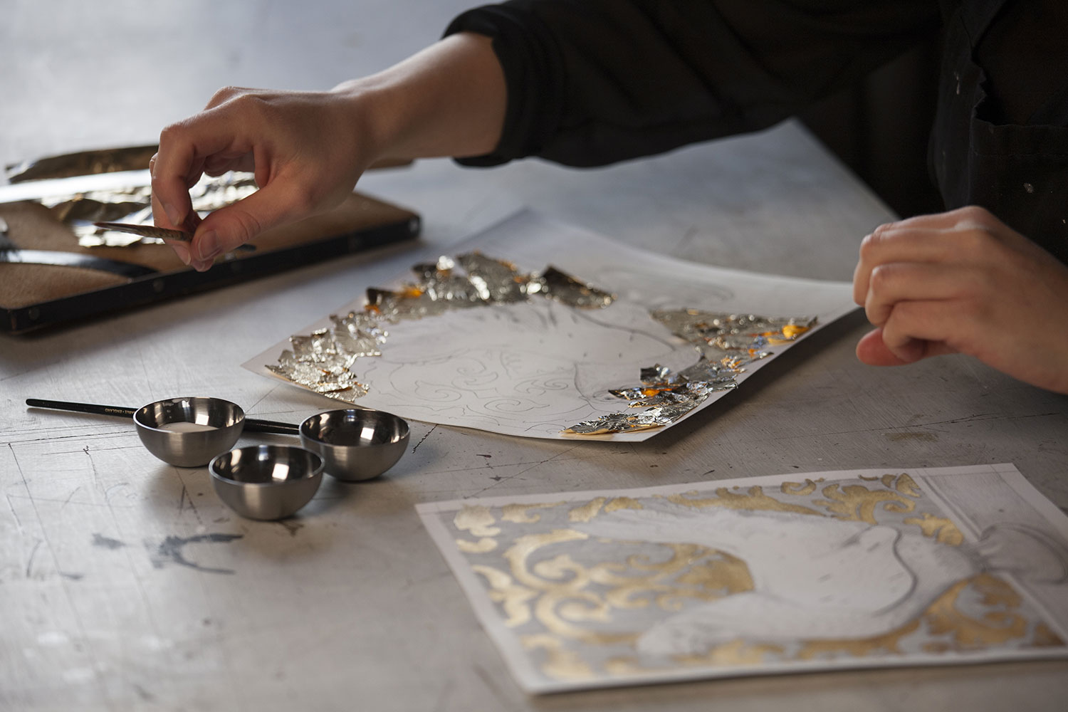 I draw in pencil on paper and gild the background with gold leaf. Gilding is a restoration technique I’ve stolen from my mother’s world: when I first used it to enrich my drawings, I knew at once it was a perfect match for simple graphite. Together, grey and gold became my signature.