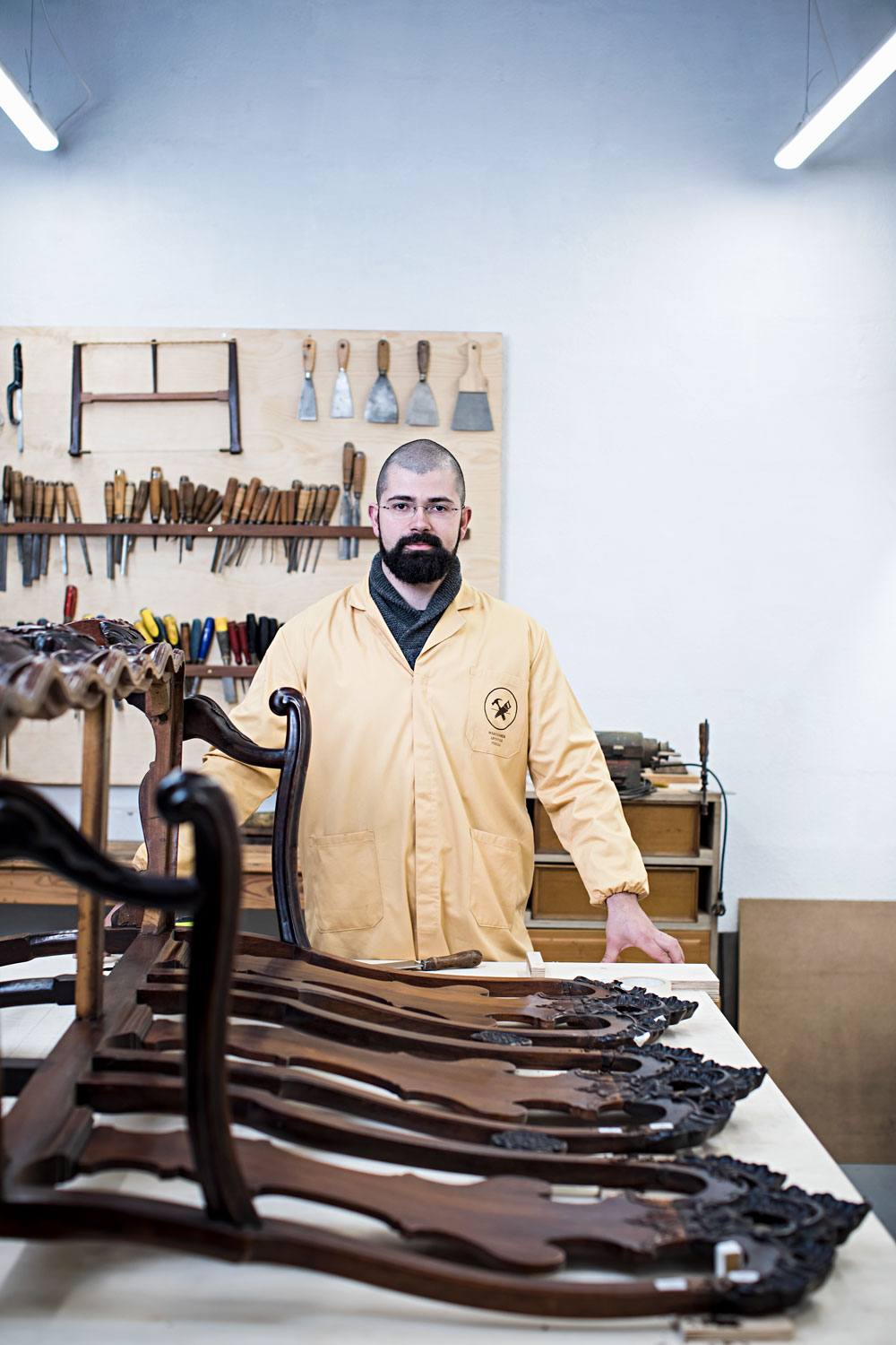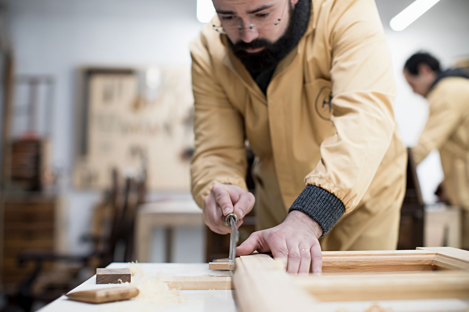 Tiago Borges may be young but his voice reveals maturity when speaking about inheriting his grandfather’s workshop. “He was a joinery master. l learnt hands-on with him as a child, then more formally when I turned 16”. A wood carving course at Fundação Ricardo do Esprito Santo Silva and a bench joinery course at Leicester college in the United Kingom, deepened his knowledge of handmade joinery, wood inlays, carving, polishing techniques, hand planning and auto cad drawing. Such diverse skills allow him the scope to work on traditional cabinets, restoring 17th-century furniture or developing contemporary pieces from scratch. As Tiago nurtures his daily creative relationship with wood, he feels confident about perpetuating his family’s history in the art of wood making.