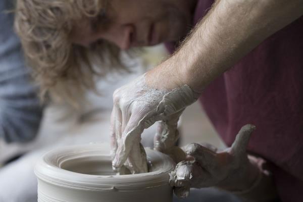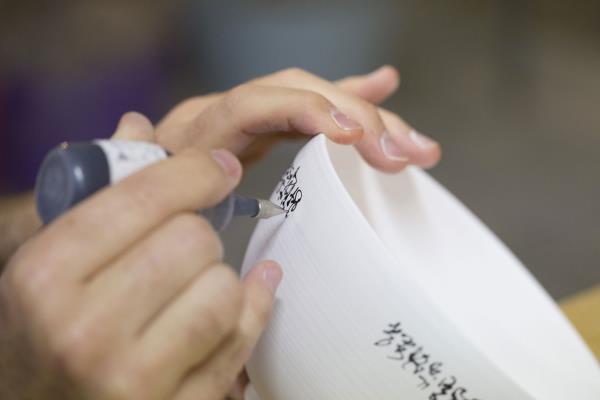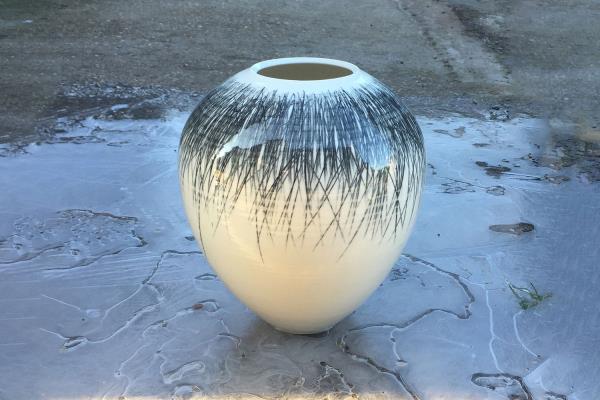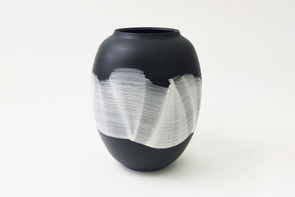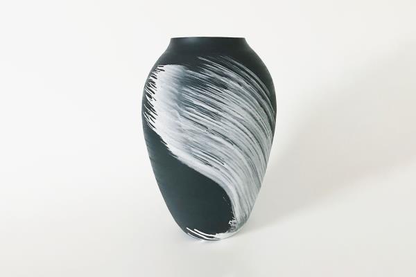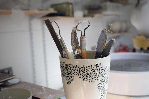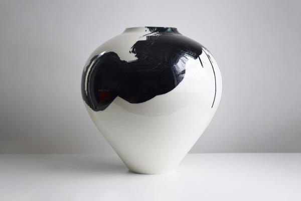 Tom Kemp describes himself as being a self-taught artist working with two different crafts: calligraphy and pottery. When he was still working in theoretical computer science, he studied the brush techniques of ancient Roman signwriters. “I became fascinated by the square-edged brush when I saw someone using one in a very free way, brushing water onto a dusty blackboard. Something about the shiny, huge, elegant black strokes was very appealing.” A weekend pottery class got him hooked on ceramics but it was only once he started selling his first pieces that he decided to take the plunge, change careers and open his own studio. Inspired by any ancient writing and pottery, his pieces are an expression of flow manifested in circular shapes and large brush strokes.