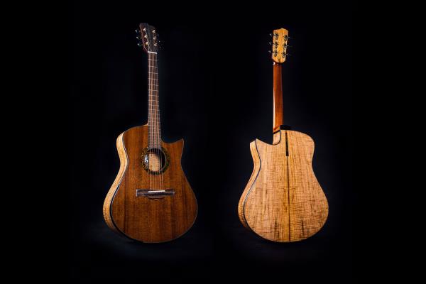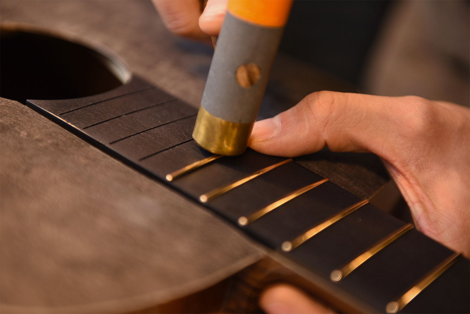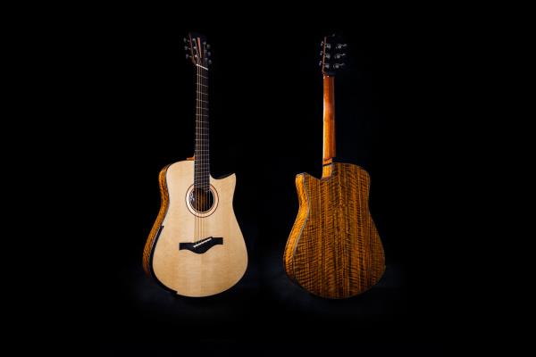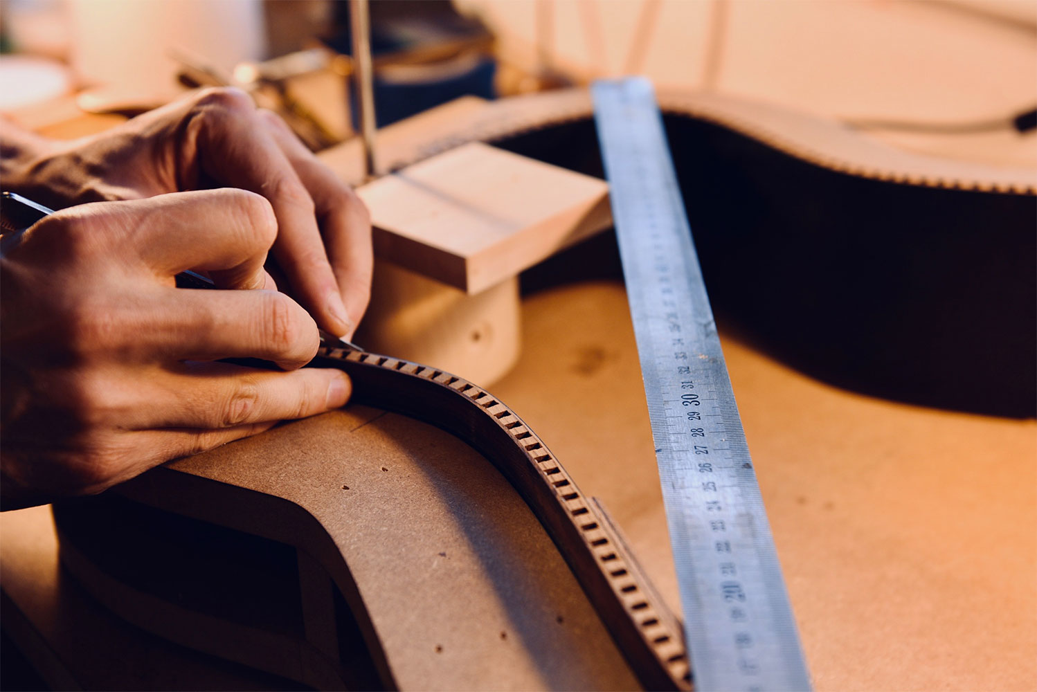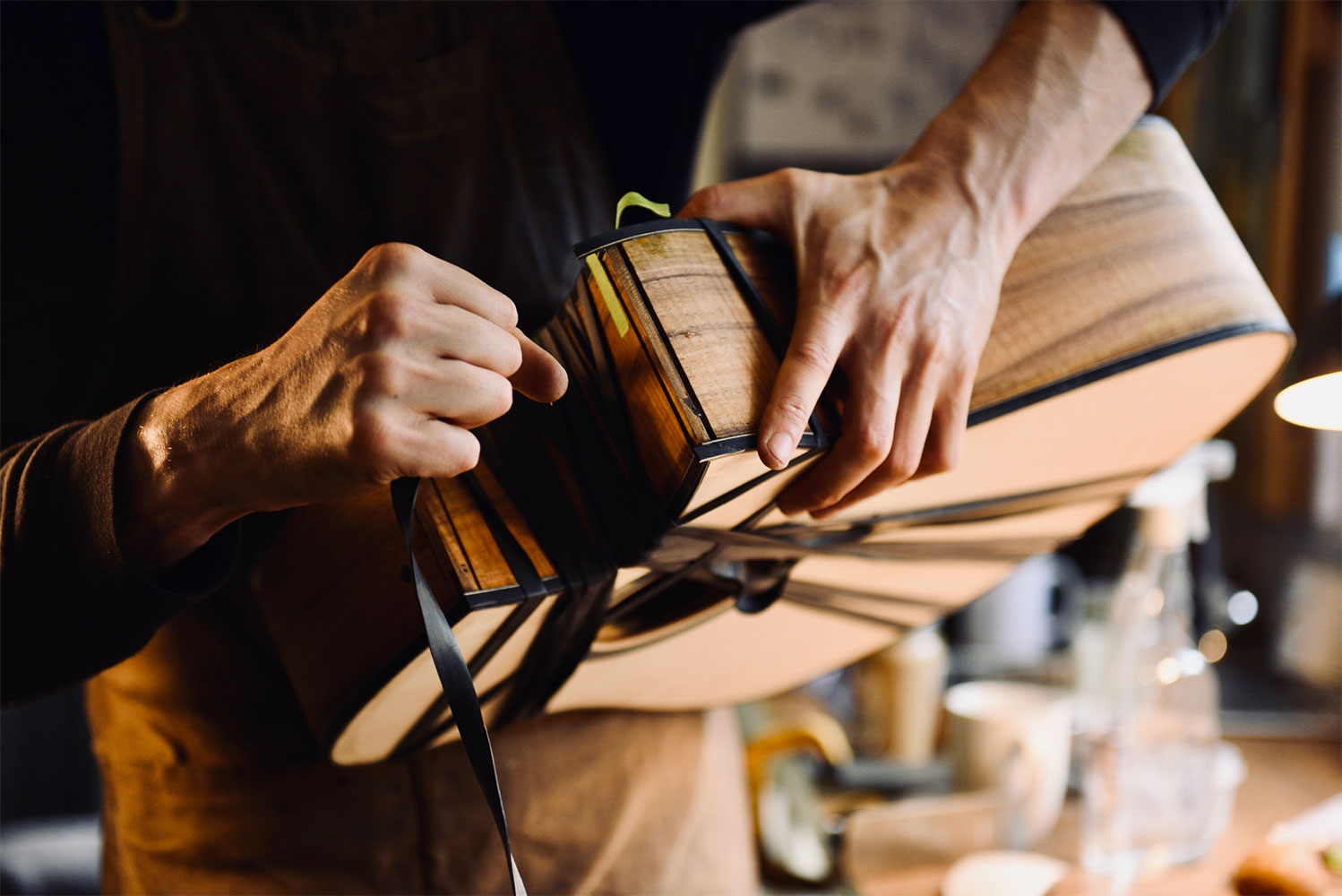 Having studied product design at the Glasgow School of Art, Tom Sands worked as a cabinetmaker and created bespoke high-end furniture before deciding to move into making guitars. He trained under Ervin Somogyi, who has been at the top of his field for 50 years, before setting up his own studio in Yorkshire. He is learning to master what’s known as the ‘voicing’ of the guitar in the methods of his mentor. Fundamentally, the acoustic guitar hasn’t changed since its first Spanish iterations, but Tom is developing new methods of construction and decoration. He takes inspiration from contemporary product design, modern architecture and automative design as well as the teachings of Bauhaus.