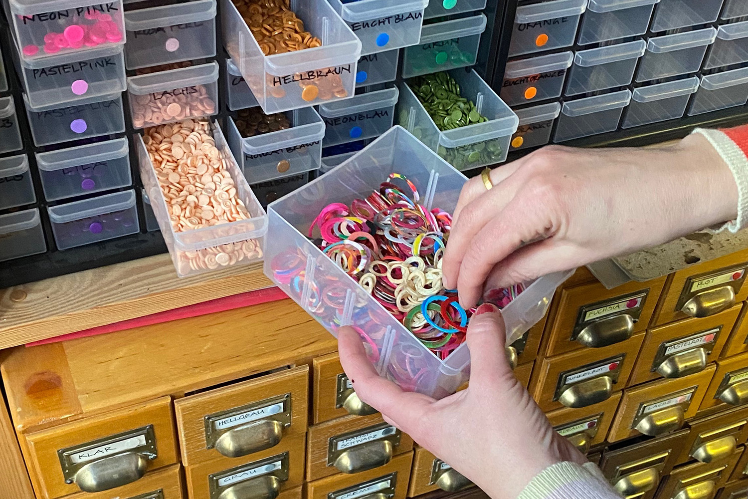 Karola Torkos studied textile design in Halle before starting an internship at a goldsmith's workshop in Erfurt. She then studied jewellery with Dorothea Prühl. "For me, switching from textiles to jewellery was about being able to work alone on a collection as a goldsmith, as opposed to being a piece of the puzzle in the textile industry." Karola decided to study jewellery at the Royal College of Art, in London. Today, her jewellery reflects her interest in textiles, her obsession with circles, and her desire to make something valuable out of seemingly worthless materials, such as plastic. In London, Karola collaborated with jewellery enthusiast Barbara Cartlidge and her gallery Electrum. Her colourful experimental collections reached a large audience and she has had many exhibitions in the UK and Europe. Since moving back to Germany in 2013, Karola works from her own studio in Lübeck, while remaining active as a member of the Erfurt Jewellery Symposium.