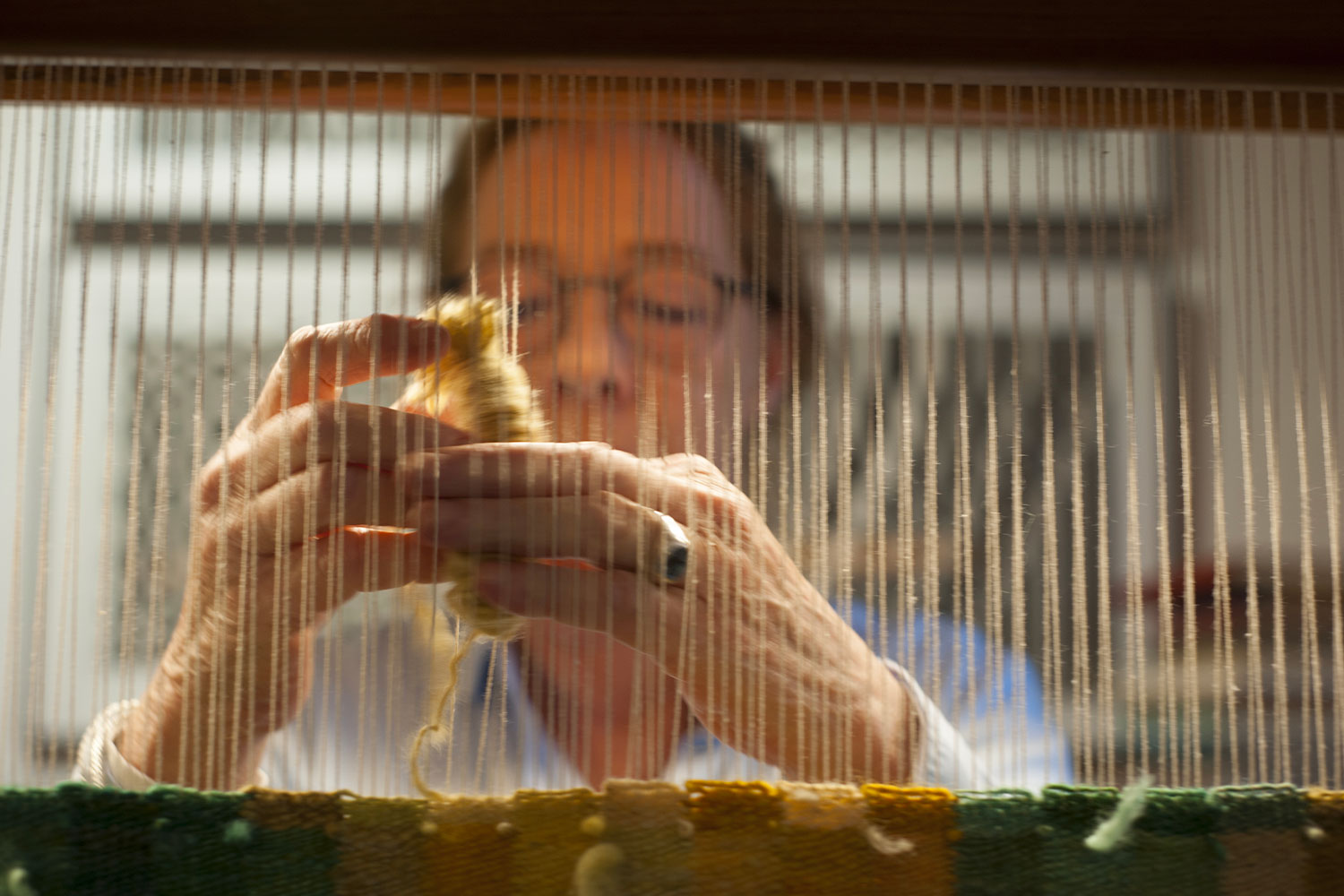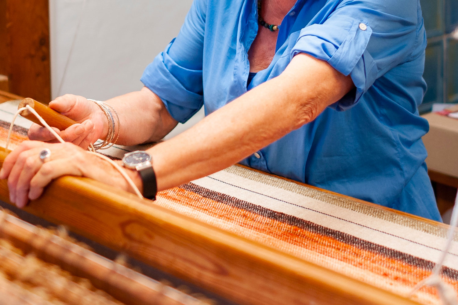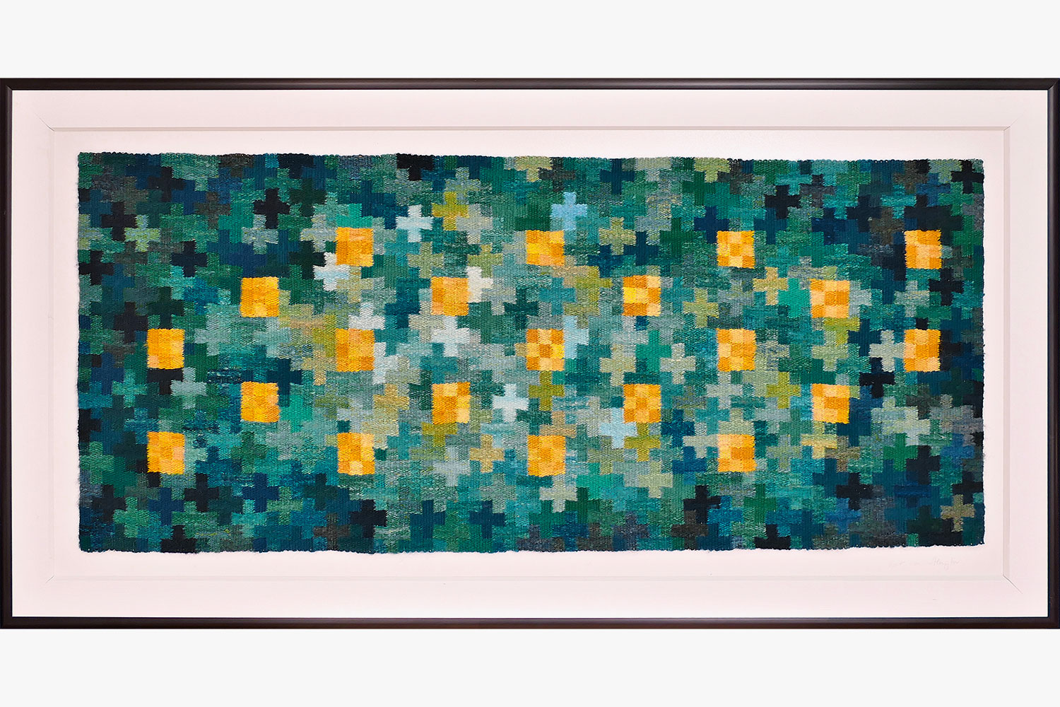 Kate von Stenglin and her husband, the ceramicist Alexander von Stenglin, own an idyllic farmhouse and garden in Mecklenburg Vorpommern, which they affectionately call Eichenhof. It houses both Kat's hand weaving workshop and her husband's ceramics workshop, and also serves as a living and exhibition space for the couple. Kat is a master hand weaver and an avid math enthusiast. Her Goblins are woven from planographic images. The square is her starting point to translate images from her mind to paper and then the loom. Black, white and red are her preferred colours. However, she also enjoys showcasing the entire colour palette of plant based dyes in her plant inspired tapestries.