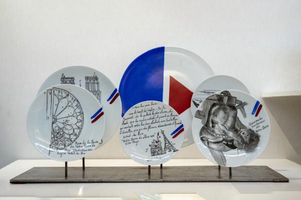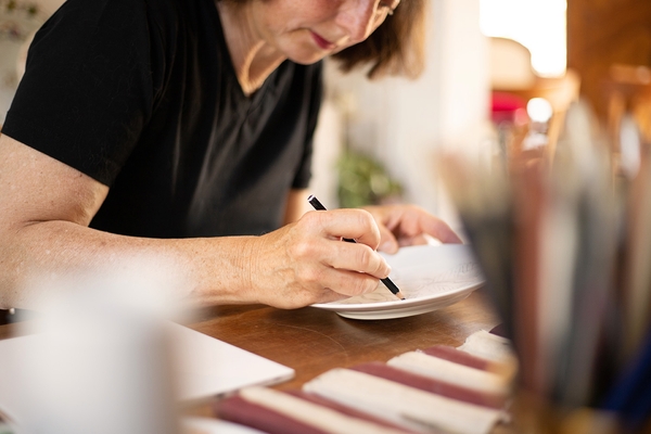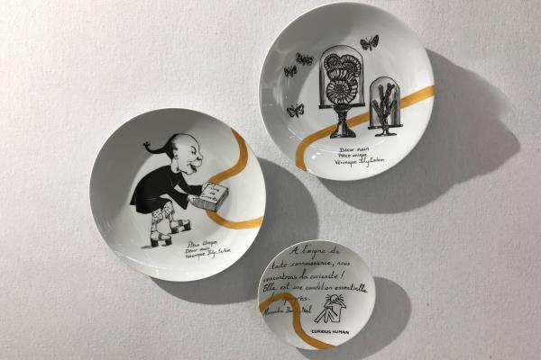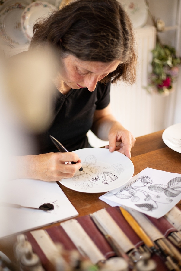 Artist at heart, Véronique Joly-Corbin first trained in oil painting at the Beaux-Arts de Paris before her curiosity led her to follow a course in painting on porcelain. Ever since, she has applied this technical know how to expressing her creativity on authentic Limoges porcelain. For Véronique, the calligraphy pen is more than a tool, it is the link between her stories, the common thread of her inspirations. It has gradually led her to explore different graphic universes such as engraving, writing and Japanese prints. "The pen leads to the line", she states. Each of her delicate drawings is the result of a rich documentation she carries out. Along with wall-hung plate installations, Véronique's work extends to furniture and sculpture.