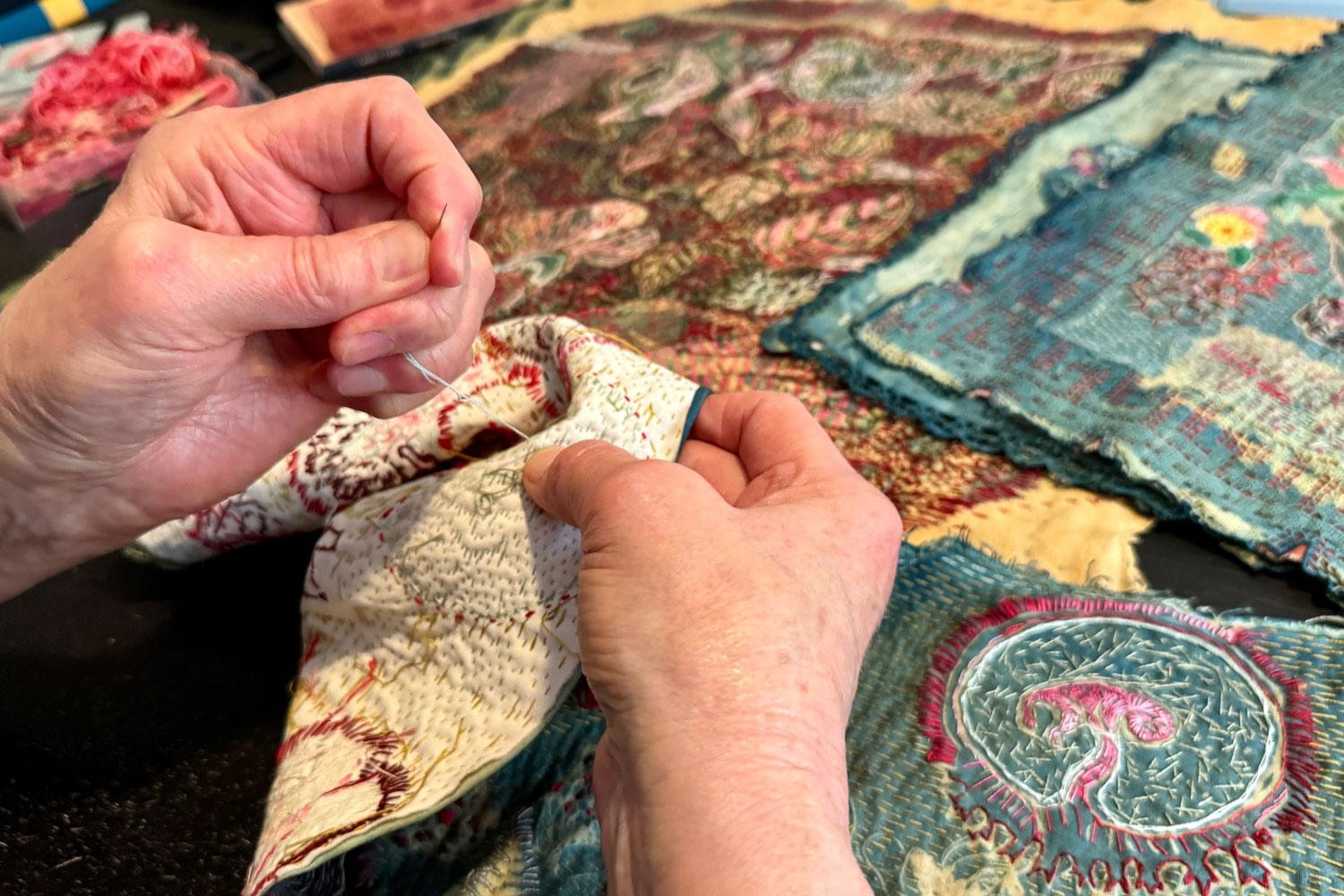 Willemien de Villiers’ embroidery rejects perfection and embraces irregularity. "Material choice is central to this approach," she says. Willemien works exclusively with second hand vintage cloths, drawn to the histories embedded within the fabric. Through cyanotype printing and eco-printing, the surfaces she works on are further transformed as she introduced botanical forms and deliberate staining. "What is usually regarded as damage becomes storytelling," she explains. "A stain marks an event, a moment lived." Willemien integrates recurring motifs with appliqué, including lifesaving imagery, plant forms and references to human anatomy. Through stitch, stain and repetition, her work resists the idea of the blank canvas, which allows the cloth to hold deeper meaning.