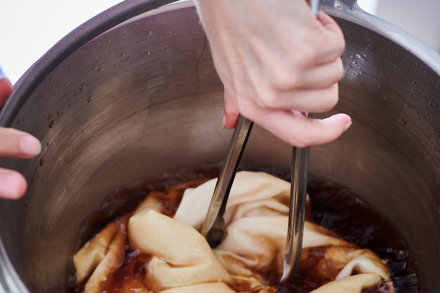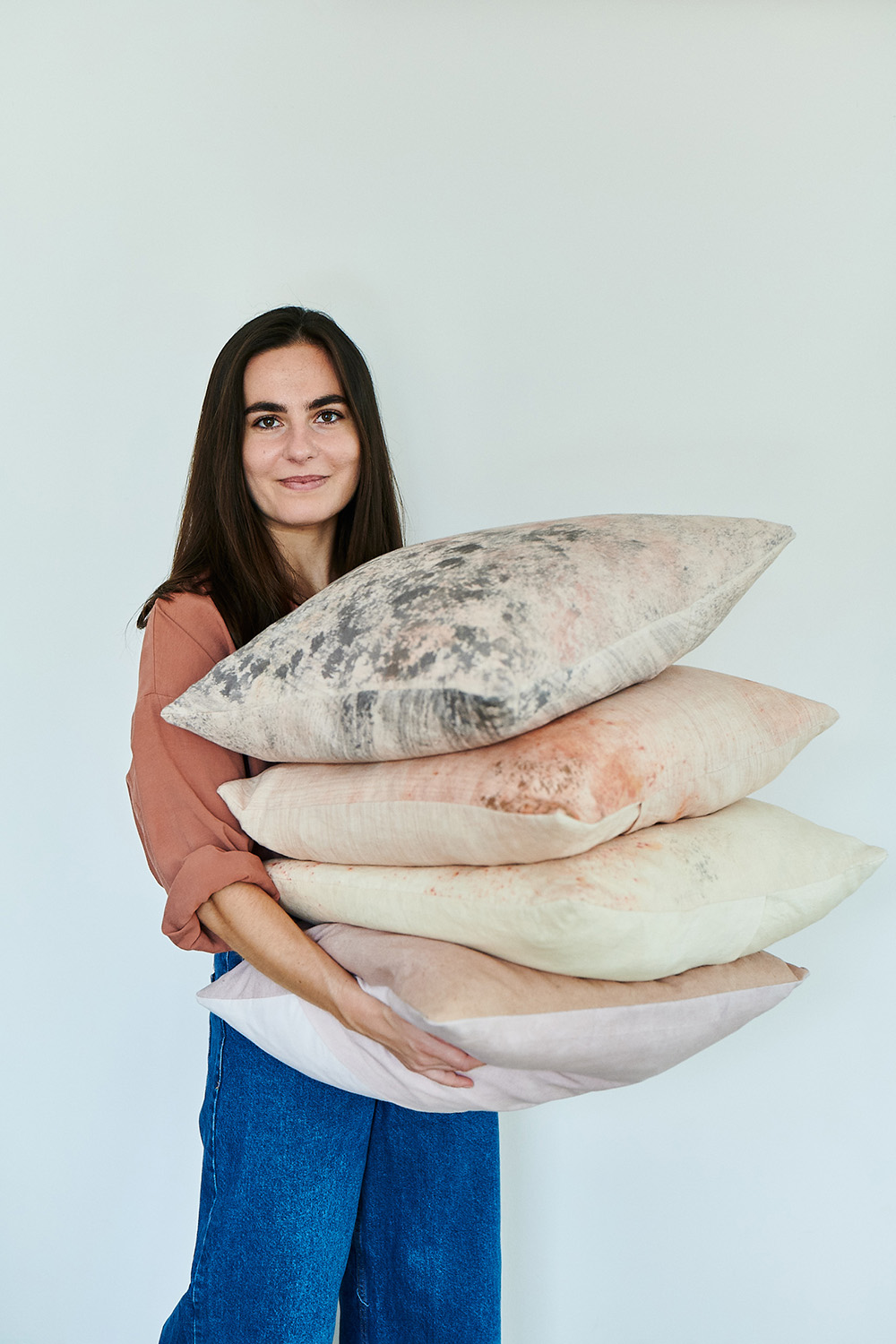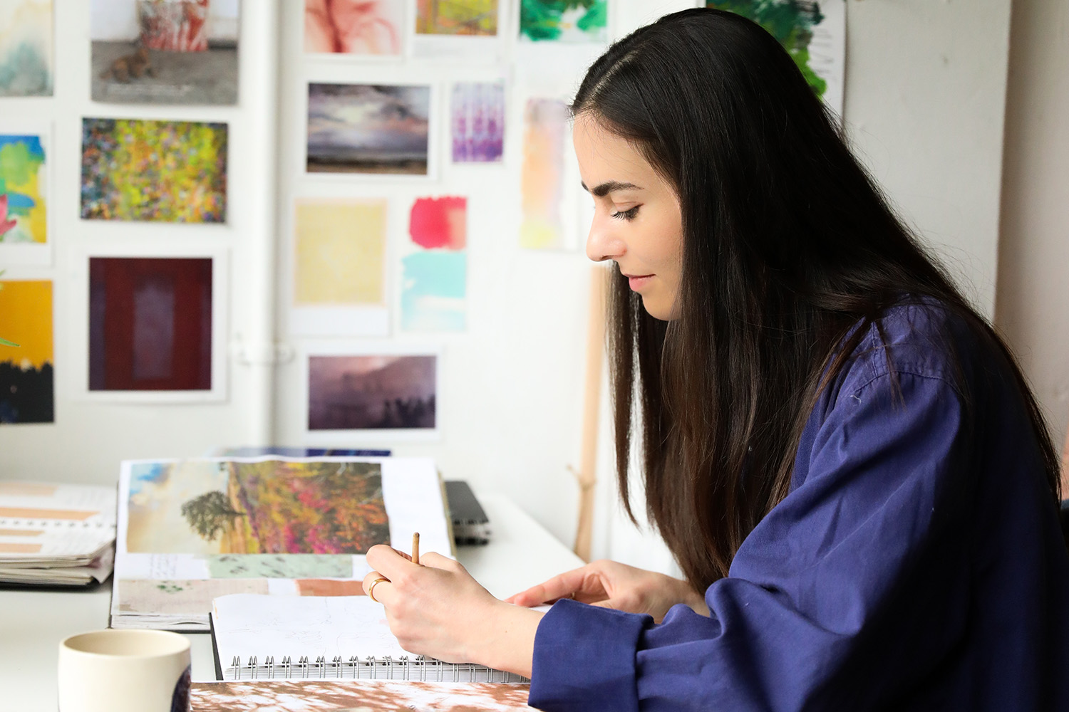 Ellen Mae Williams is a young British textile artist specialised in hand-painting and hand-dyeing on natural fabrics. Her practice combines her own creativity, something she has been aware of since her childhood, with the skills acquired over an extensive course of study: a BA degree in textile design and a Master in Textiles at the Royal College of Art in 2019. Nature is the absolute protagonist of all her creations, not only in terms of inspiration and subjects, but also in terms of sustainability. Ellen Mae only paints on natural fabrics with the natural dyes that she prepares herself, in tune with the seasons and the subtle beauty each one brings. Her designs are mainly abstract interpretations of natural landscapes through mark-making.