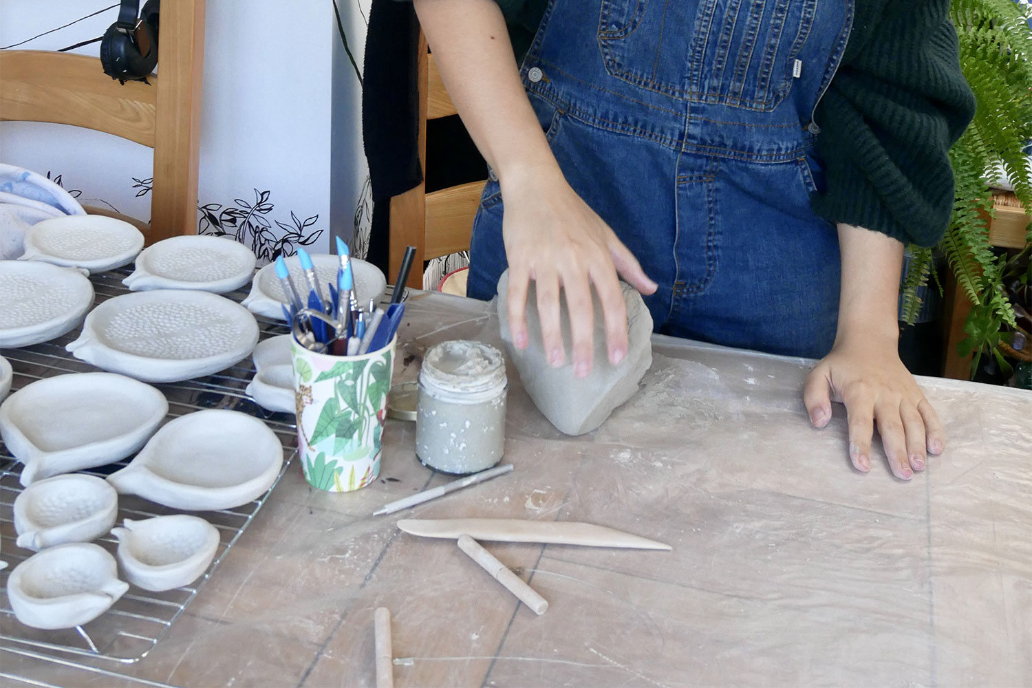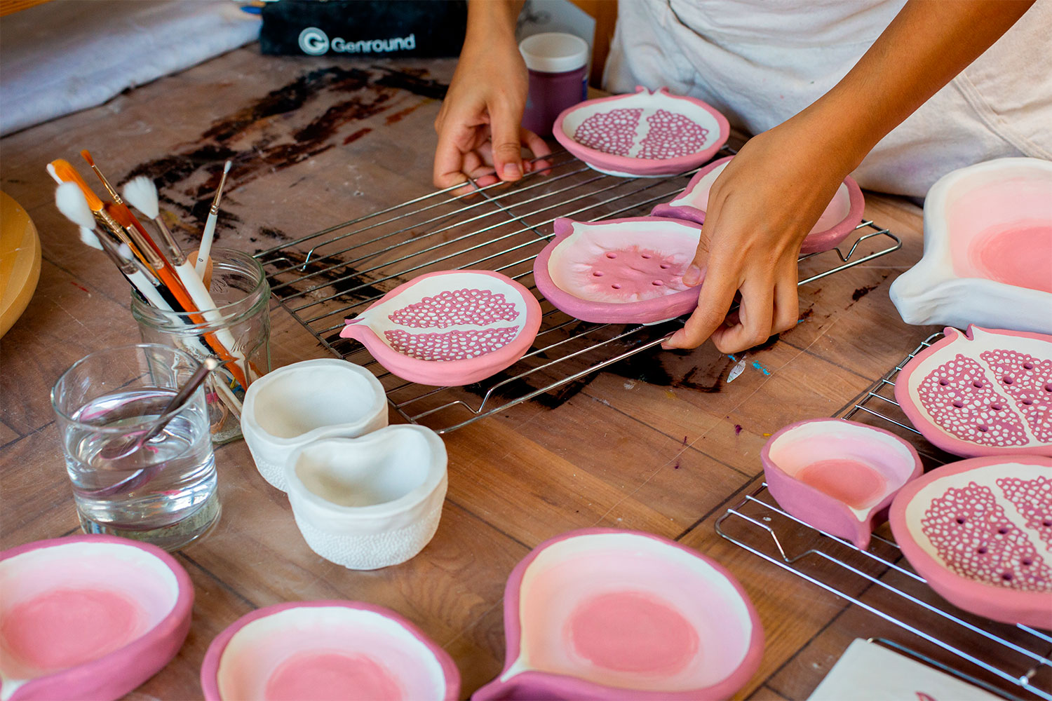 Yasmin Falahat is definitely what you would call a rising star. After initially studying textile design, the British artist decided to take a short beginners' ceramics course in 2018 and has been working with clay ever since. With her unique and recognisable ceramics shaped like figs and pomegranates, she quickly established herself as a craftswoman to watch. Having gained a steadily growing following on social media, she is now recognised across many platforms and her work has been shown in several prestigious magazines. As well as generally enjoying the traditional aspect of ceramics, which she describes as “a connection to the past” in various different cultures, Yasmin finds inspiration in her personal heritage, to which she relates through art.