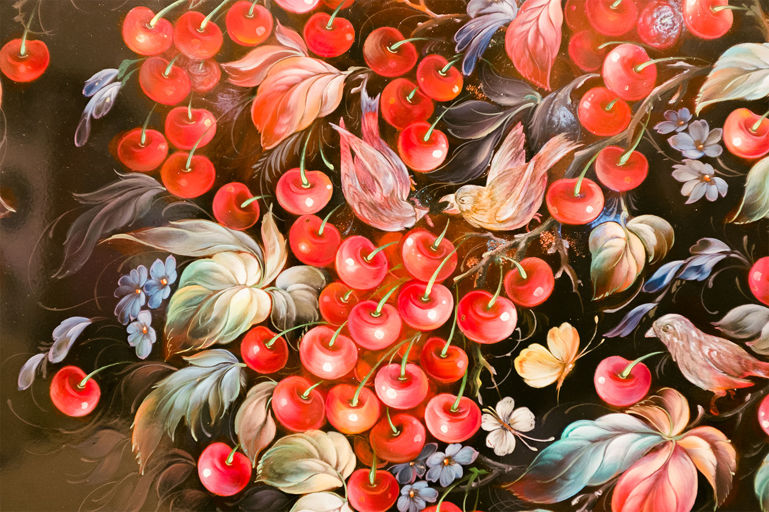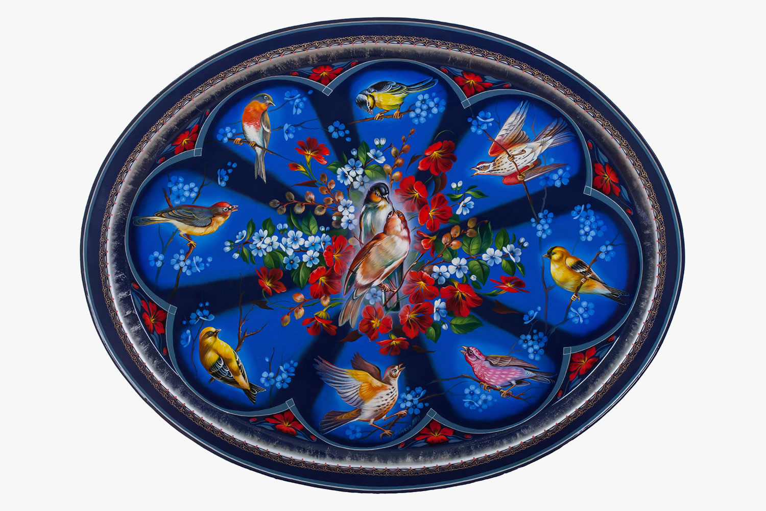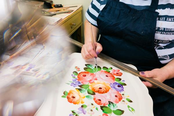 Over the factory’s long history, its craftsmen have created more than 150 different shapes of Zhostovo tray. Some of the shapes are still made only by hand – cold-hammered from metal sheets – while others require modern equipment. The signature pattern is an exuberant flower bouquet, but fruit motifs and landscapes are also popular. They are traditionally painted in oils with squirrel brushes, using vibrant colours against a black, red, green or blue background. The edges of the trays are decorated with intricate floral designs, and the lacquer is made with a special palm resin. It takes around 14 days to create a single tray.