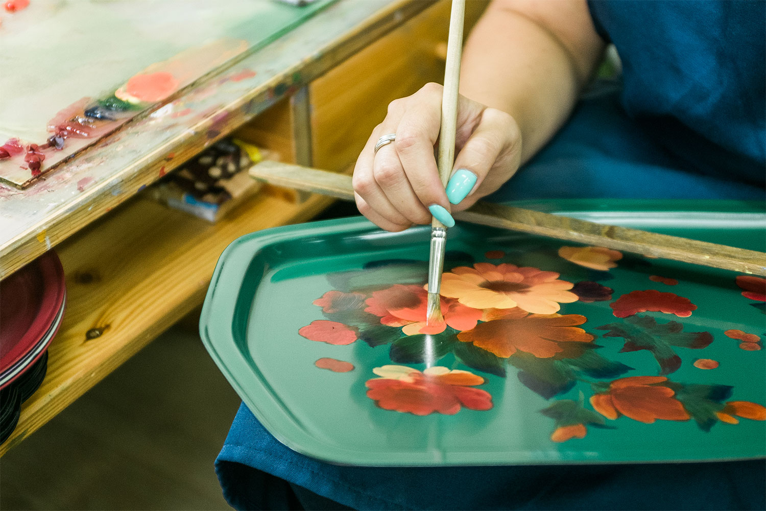 The history of Zhostovo Decorative Art dates back to 1825, when the Vishnyakov brothers – former peasants, who bought themselves out of serfdom – opened a workshop in Zhostovo village. The brothers’ genius was to combine the craft of making metal trays, common in the Urals region, with the art of making lacquered miniatures, for which the nearby village of Fedoskino was known. The Russian tradition of tea drinking has provided a solid demand for these colourful trays right up until the present day. Today, the factory employs around 80 artisans.