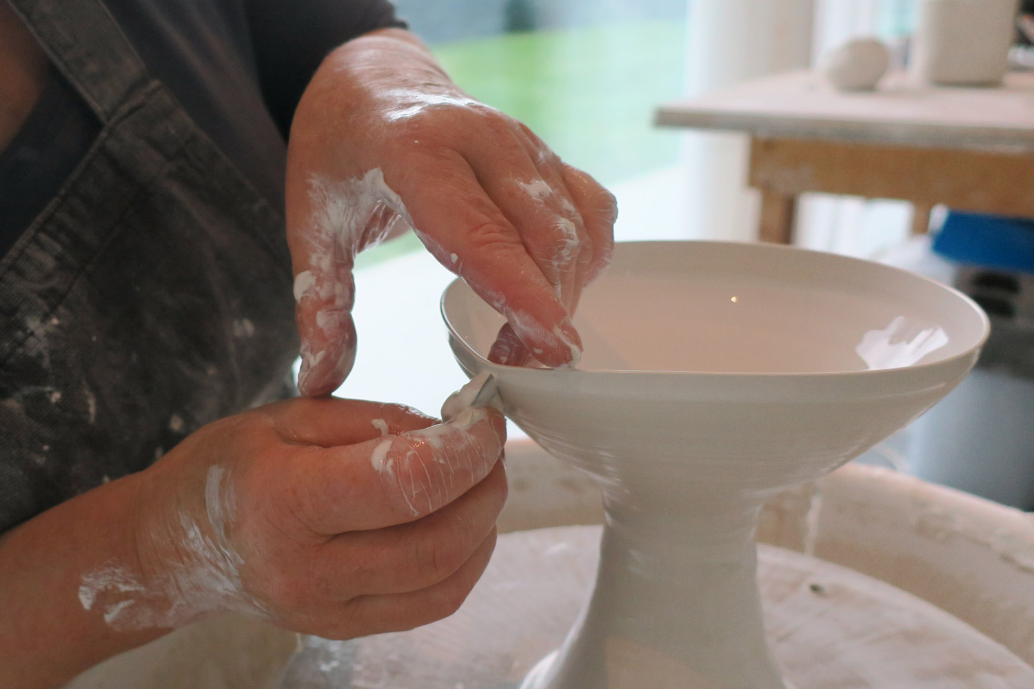 Anima Ross started studying ceramics at the art academy in Ghent. She recalls that, “In those days, working on the potter’s wheel was not offered at an academy of ‘arts’. So, to build up my throwing skills, I travelled to the south of France during the summer, going from village to village, from potter to potter.” Then, she started her own business, went on to teaching, and studied new techniques, becoming increasingly engrossed in porcelain. “For the last ten years I have only worked with porcelain. This ethereal and very demanding material is a challenge for every ceramicist. The pieces are thrown on the wheel, and the throwing must be done without hesitation. Corrections are not possible because porcelain has a ‘memory’: when you make a mistake, it will return after firing.