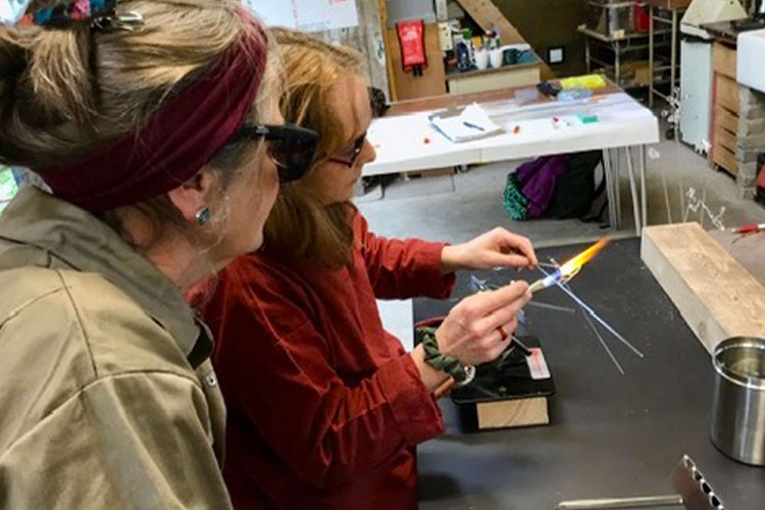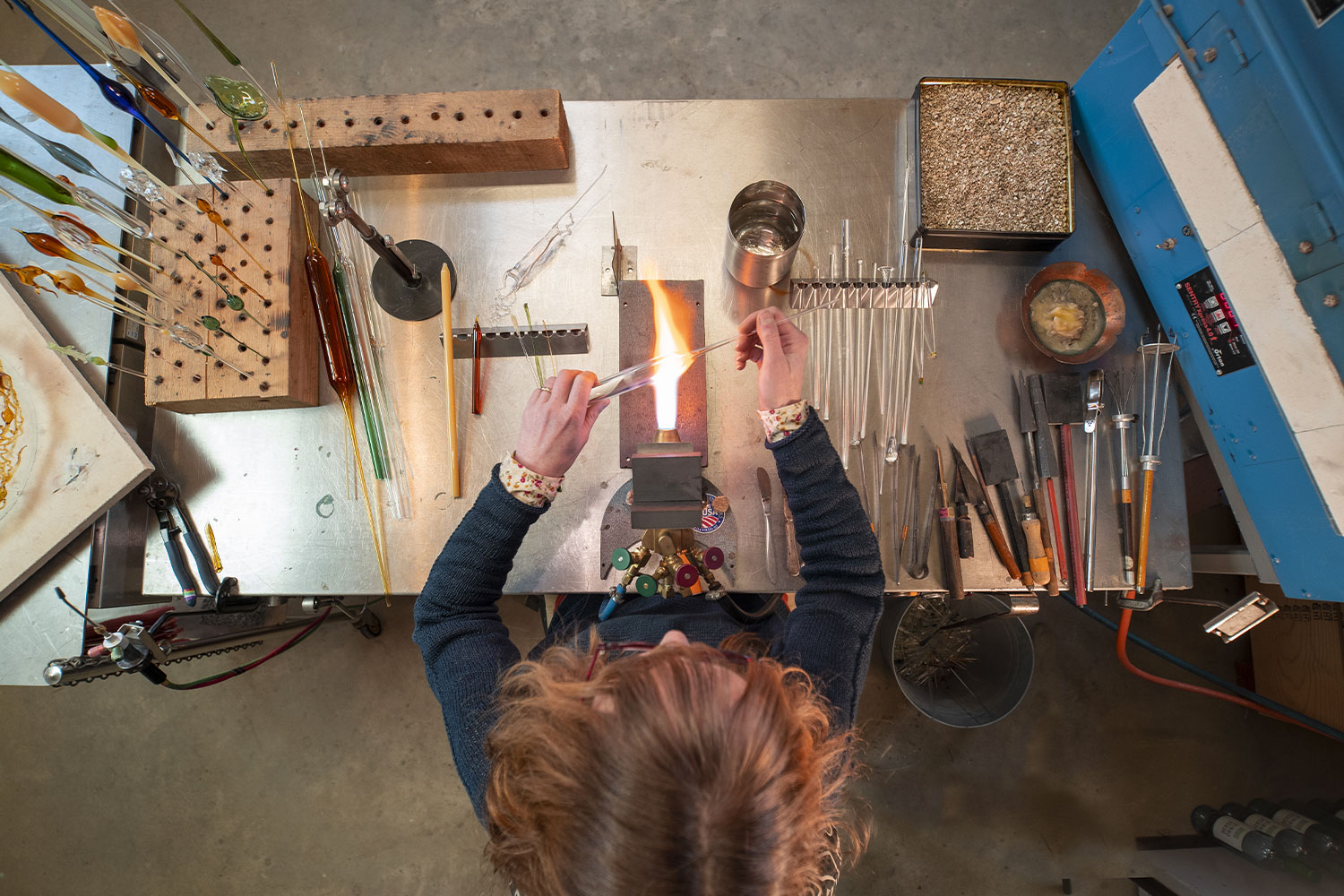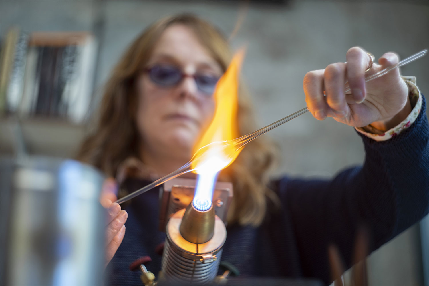 Experience working creatively with fire and glass. The unique combination of a professional glassmaking studio and close proximity to the north Antrim coast make these workshops a great choice for both short and longer experiences. Students will learn the skills required to shape and manipulate glass in the flame. Using bench and hand torches, students will discover how to make intricate structures and blown forms, and sculpt with hot glass. This is an opportunity to explore this ancient craft with direct reference to the natural world. Classes can be tailored for complete beginners, or those wanting to advance their glassmaking skills.