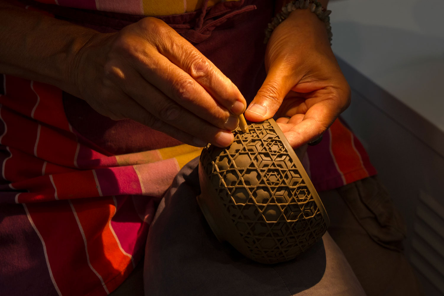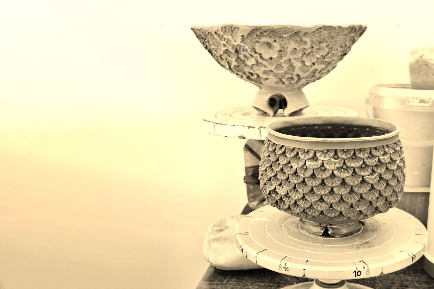 Luang Rath offers two-day (mostly weekends) ceramic workshops for shops, associations and art studios. Participants are given the chance to work with four different bowls, each thrown by Luang Rath in his preferred Treigny sandstone. A tool kit and inspiration/instruction is then provided; each day offers a new pattern which participants are encouraged to explore. Workshops are slightly customised for each group, abide by Luang Rath’s premise of “no addition no removal (of material) no drawing (work is freehand)”, and foster both freedom and creativity.