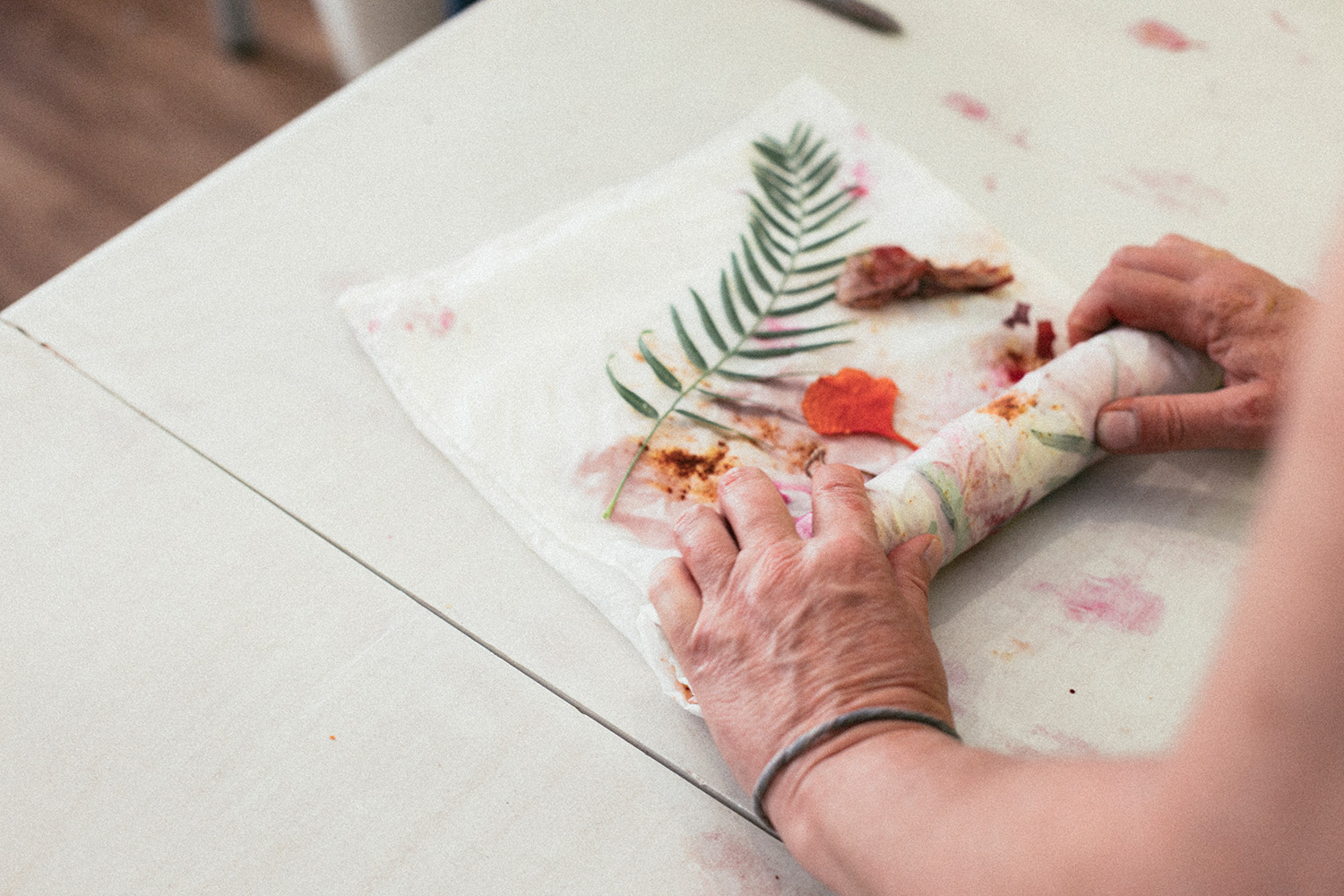 After a brief welcome, participants will be introduced to the basic aspects of natural dyeing and will visit Parque Nestor Álamo to look for dye materials with weaver Ulrike Güse. A 90 x 90 cm silk scarf is provided to experiment with designing unique patterns with all kinds of natural materials. Leaves, flowers, tree bark and locally sourced cochineal will be used to create a singular, unrepeatable pattern. With the bundle dye or eco print technique, the pigments from the dye stuff will directly be transferred to the textile. A little breakfast is provided prior to discovering the personal creation, a tangible memento of your workshop and stay in Gran Canaria.