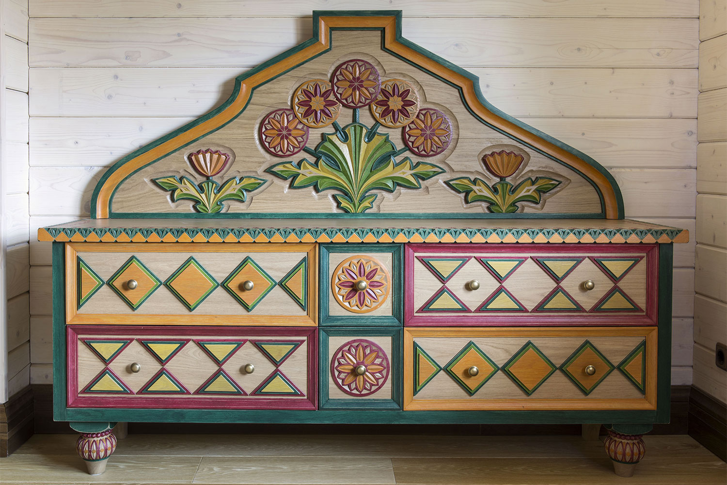 This dresser is made in Abramtsevsky style: its shape, colour and decoration carry traditional cultural code. It has a big back panel with applied carving in the form of thistle bushes. The edge of the table top is decorated with geometric carvings. The chest of drawers has six drawers on wooden runners with flower and rhombus-shaped fronts. The front legs are chiselled with carvings and resemble thistle buds. It is painted in bright colours.