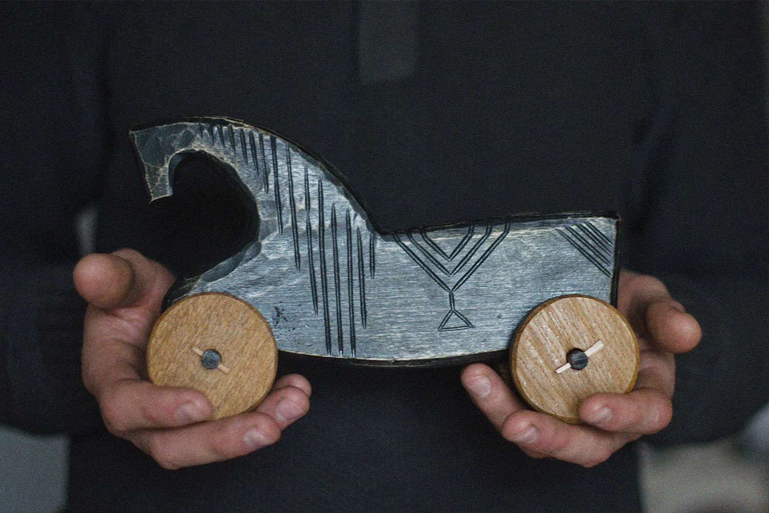 This horse on wheels is decorated with carved ornament imitating the mane and saddle, painted black, polished and covered with oil. The wheels are made of oak, oiled and fixed with wedges on a wooden axle.