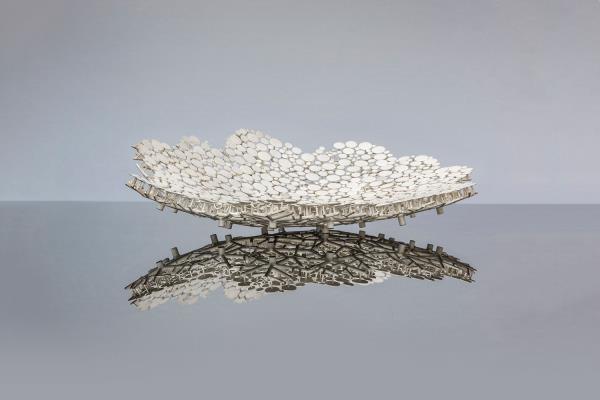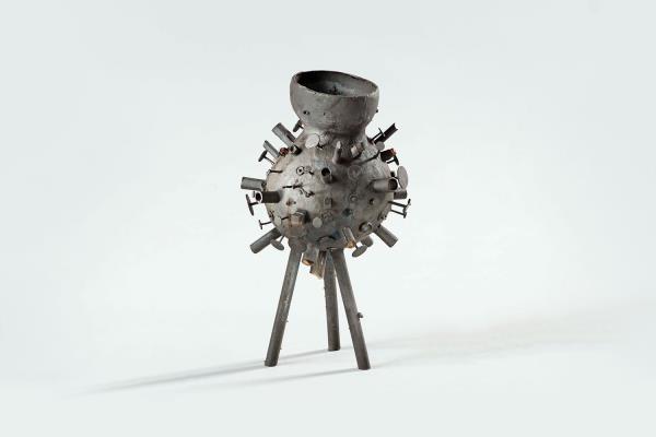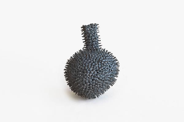 This sculptural vessel has been cast from sterling silver. As with many of Ludwig Menzel's pieces, it serves both a functional purpose and a decorative one. Its intricately shaped exterior comprises meticulously assembled nails.